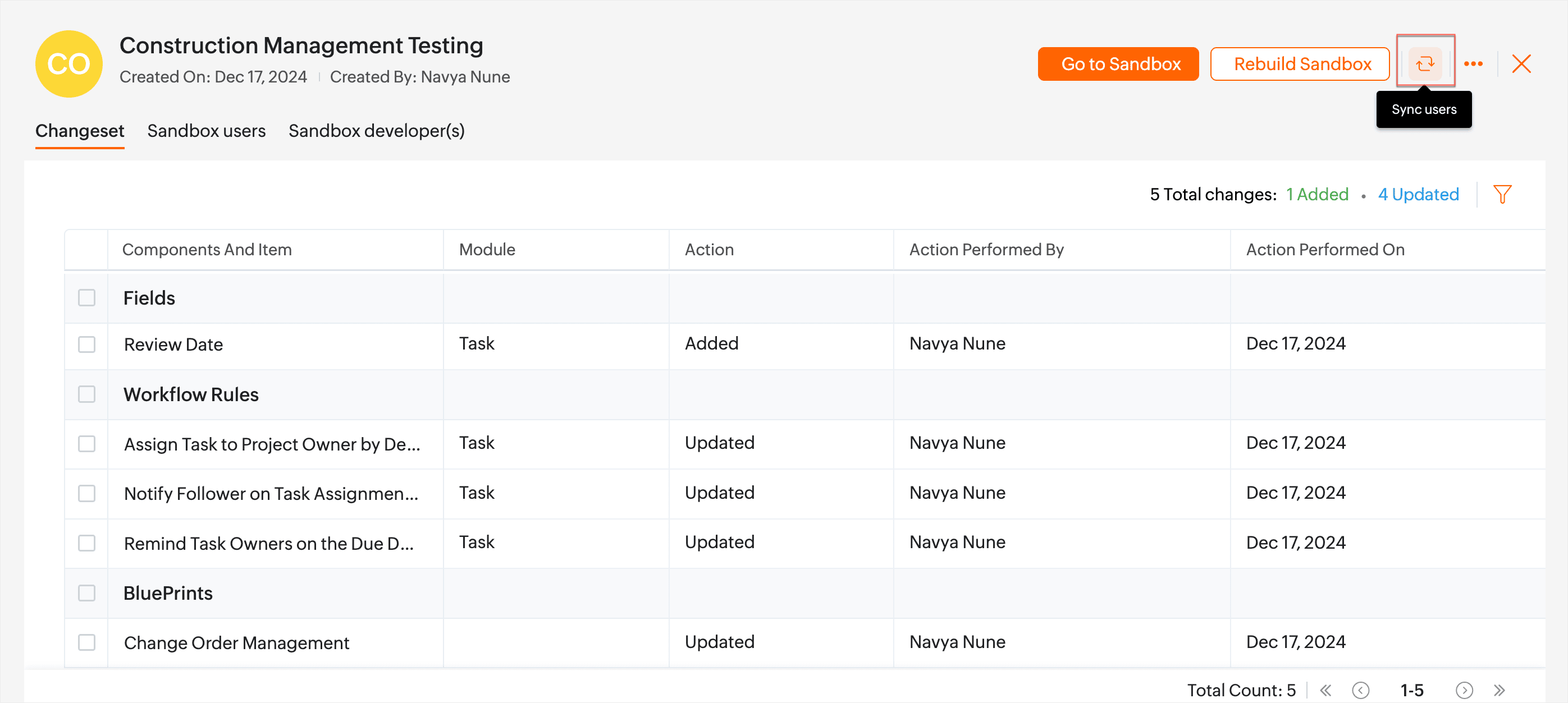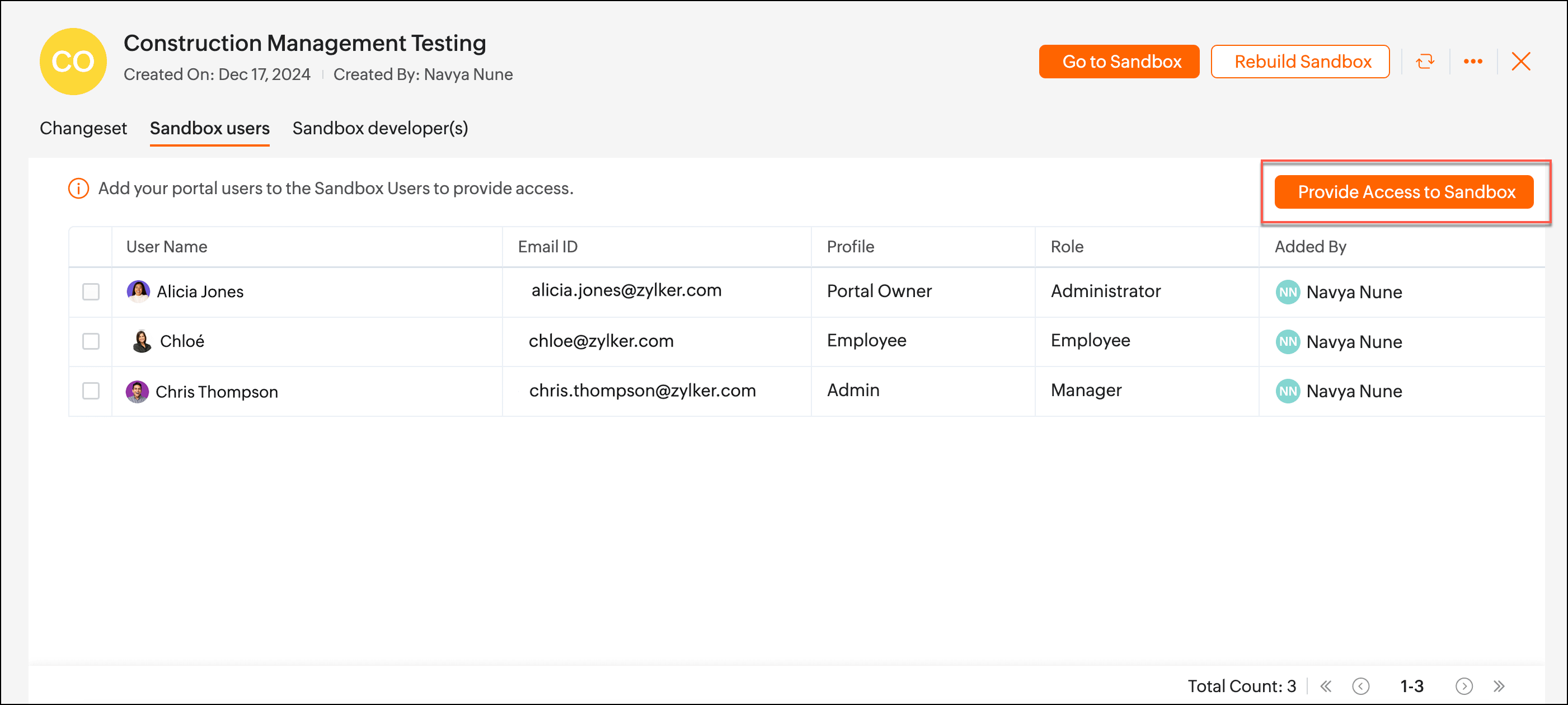 ユーザーを同期すると、本番環境のポータルで追加された新しいユーザーが、サンドボックスのユーザー一覧に反映されます。同期後、これらのユーザーにサンドボックスでアクセス権限を付与できます。