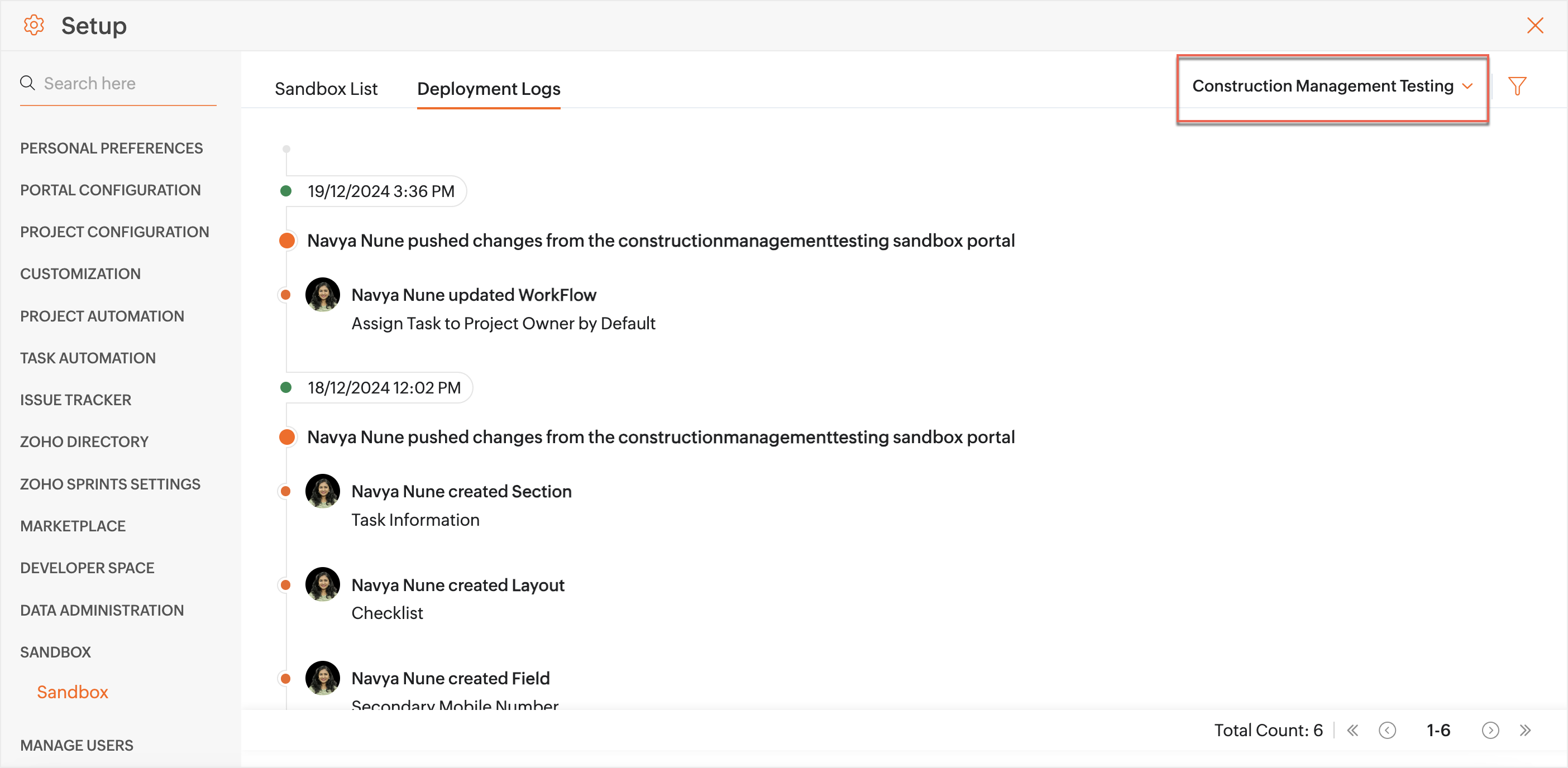 サンドボックスの作成 Zoho Projectsでは、管理者は、プロジェクトのポータルからサンドボックス(テスト環境)のポータルを作成し、検証して、適用することができます。 利用可能なプラン:最新版のエンタープライズプラン(単独) サンドボックスを作成するには 画面右上の (設定)アイコンをクリックします。 サンドボックスに移動し、[新しいサンドボックスを作成する]をクリックします。 サンドボックスの名前を入力し、必要に応じて説明を追加します。 ...