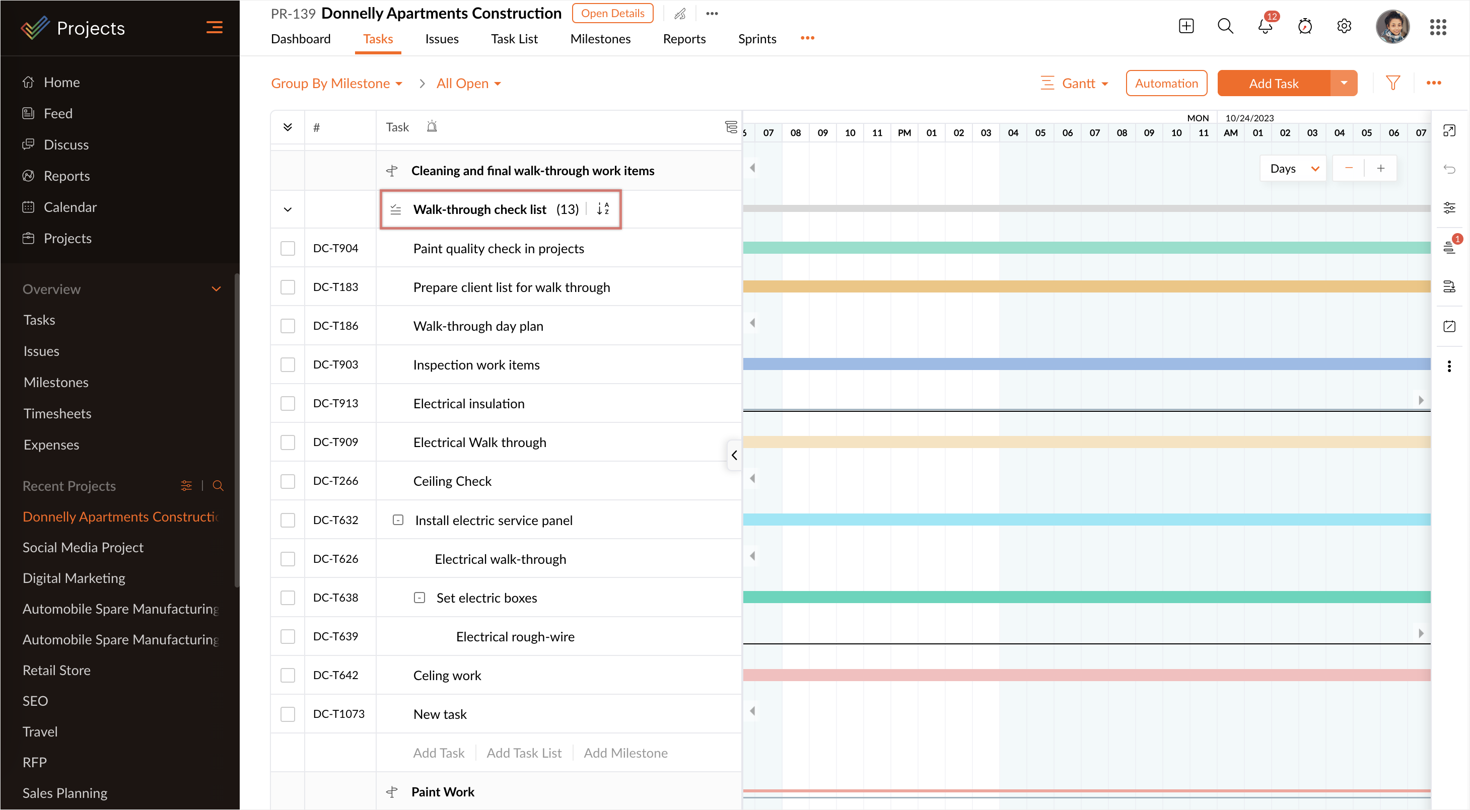 Zoho Projectsのタスク一覧では、タスクをグループ化して進捗を追跡できます。タスク一覧の機能では、テンプレートでのタスク一覧の作成、開始日の自動設定、組織内外への共有などがかんたんにできます。関連するすべてのタスクが完了すると、タスク一覧を「完了」のステータスにできます。グラフ表示のレポートでは、タスクのステータス、ユーザーの割り当て、予算の健全性を視覚的に把握できます。