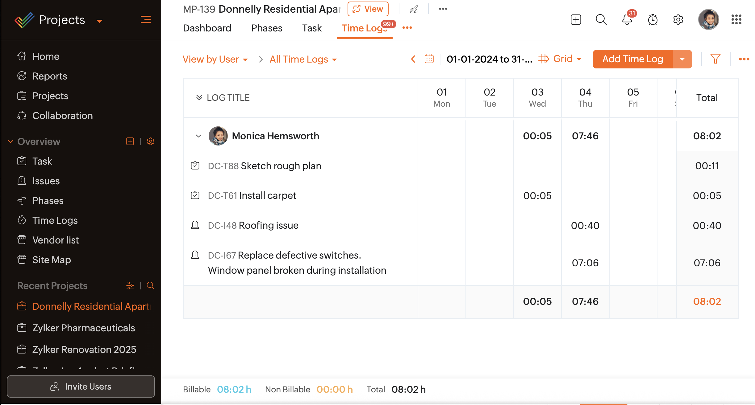 タブごとの表示では、プロジェクトとそれに関連する課題およびタスクの工数が、特定の時間枠または日付ごとにされます。タスクや課題をクリックすると、詳細ページが開き、工数の詳細を確認できます。ユーザーごとの表示では、特定ユーザーの工数と、そのユーザーが関連付けられているプロジェクトの詳細を確認できます。
