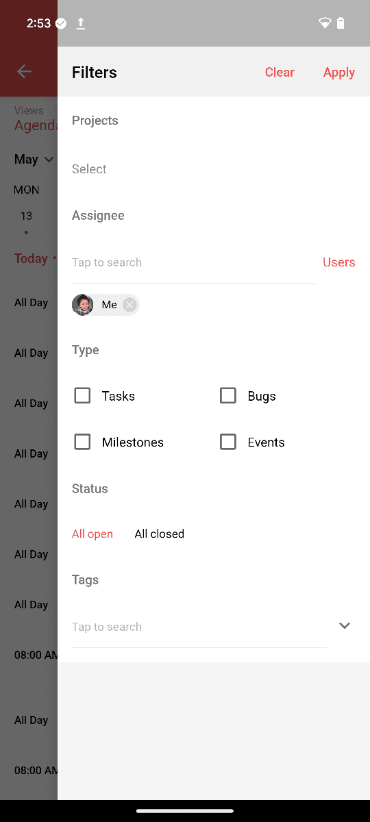 フィルター機能を使用することで、該当する活動のみを表示できます。カレンダー上の活動では、プロジェクト、担当者、種類、ステータス、タグの項目に基づいて、抽出して表示できます。