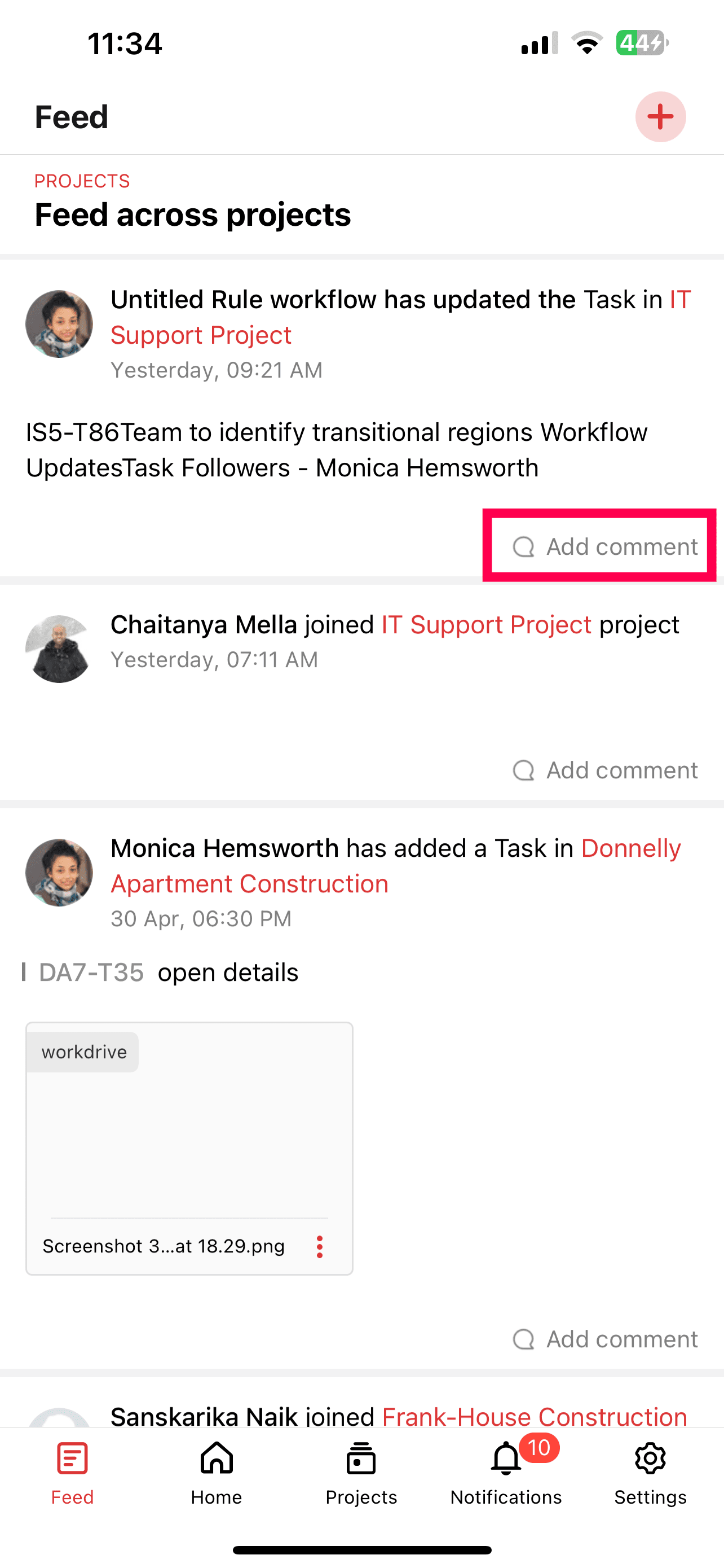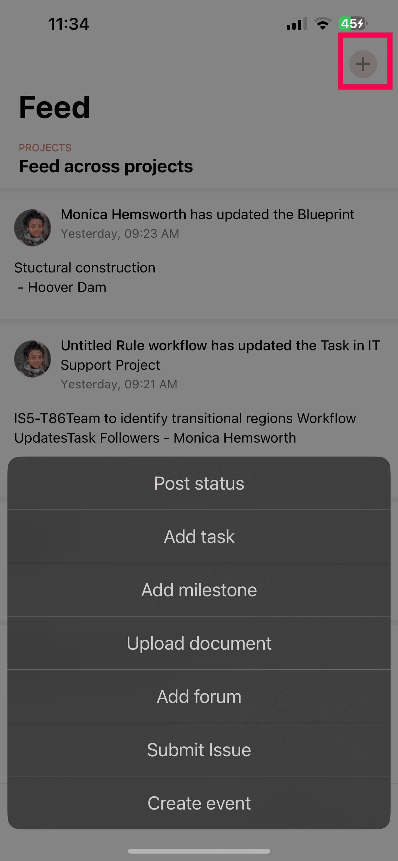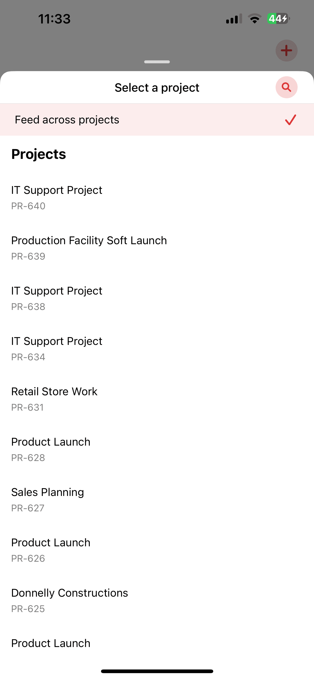 1. 特定のプロジェクトのフィードを表示するには、画面上部の[プロジェクト]をタップします。