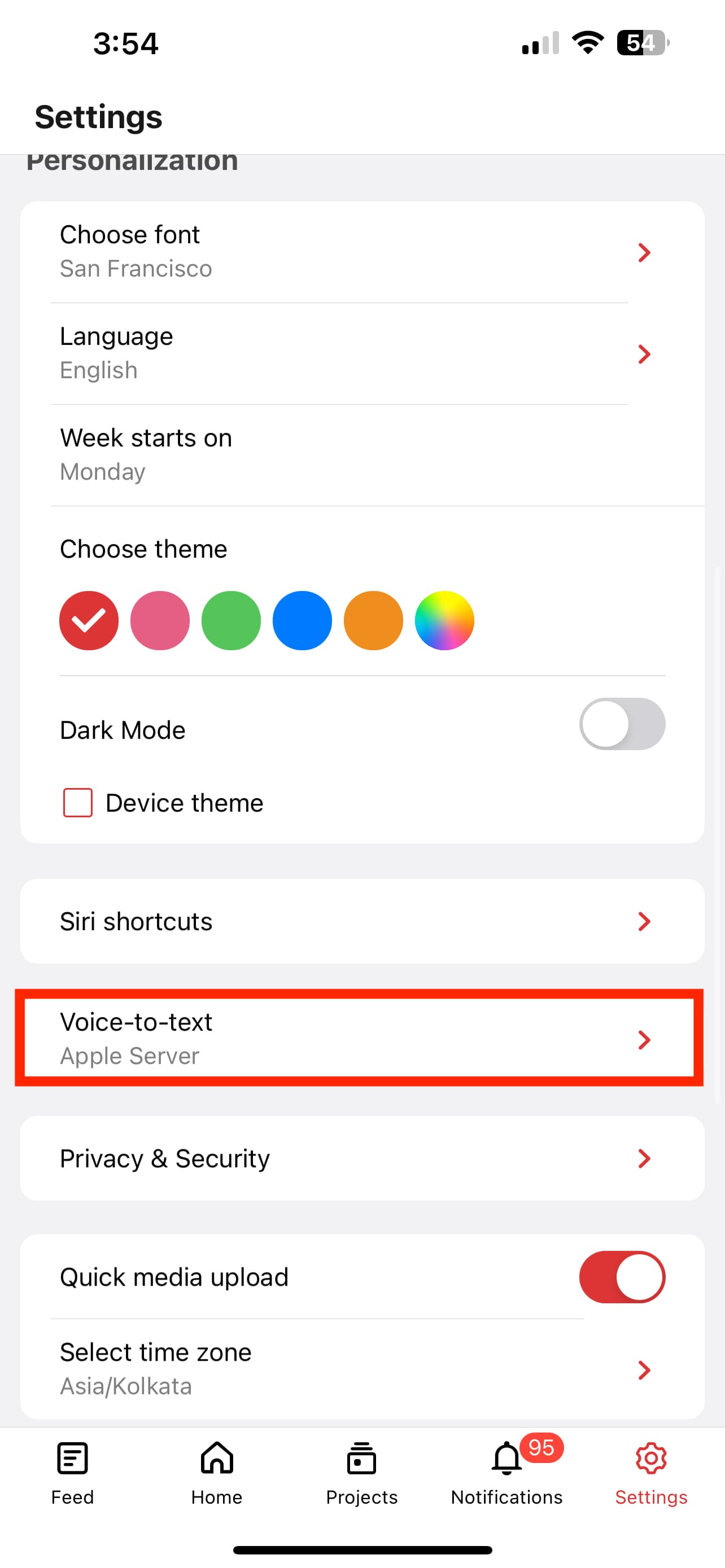 Zoho Projectsの音声入力機能を使用すると、音声メモをテキストに変換できます。テキスト変換の方法として、[Appleのサーバー]または[自分のデバイス]を選択できます。音声入力機能を使用するには、以下の手順を実行します。