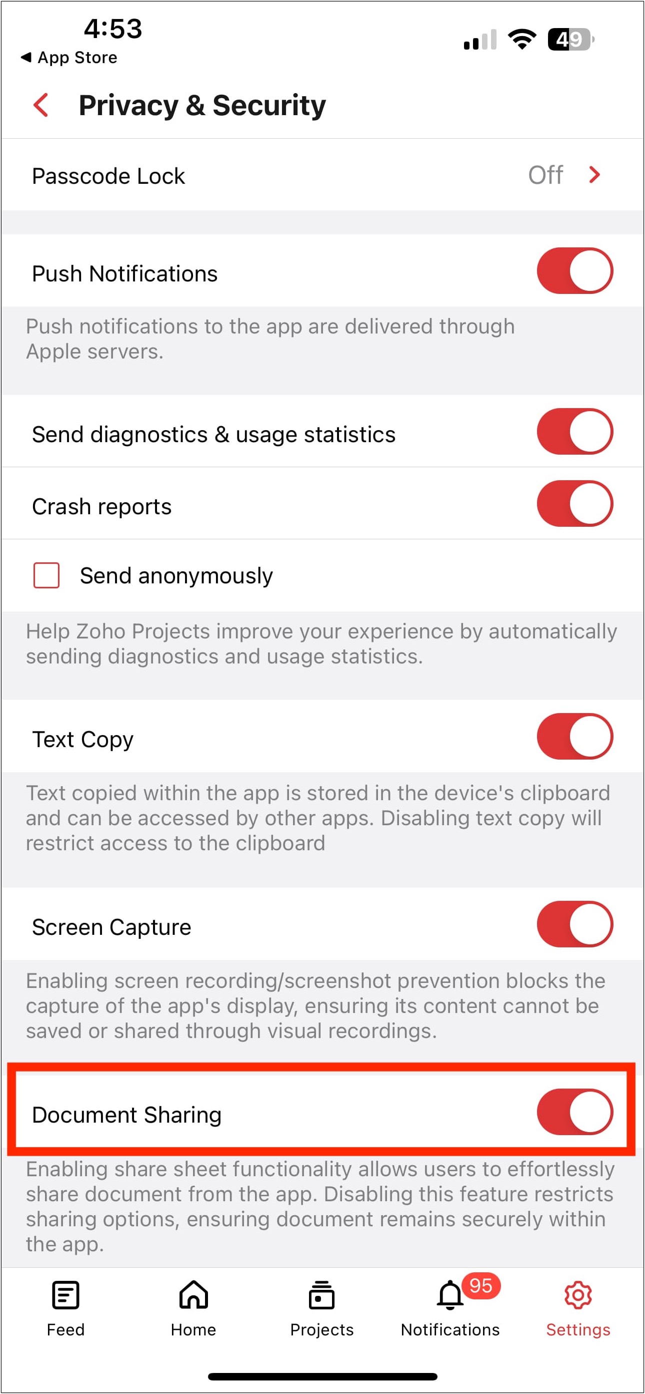 この機能を有効にすると、モバイルアプリからドキュメントを共有できます。無効にした場合は、ドキュメントの共有が制限され、アプリ内に安全に保存されます。共有機能を設定するには、以下の手順を実行します。