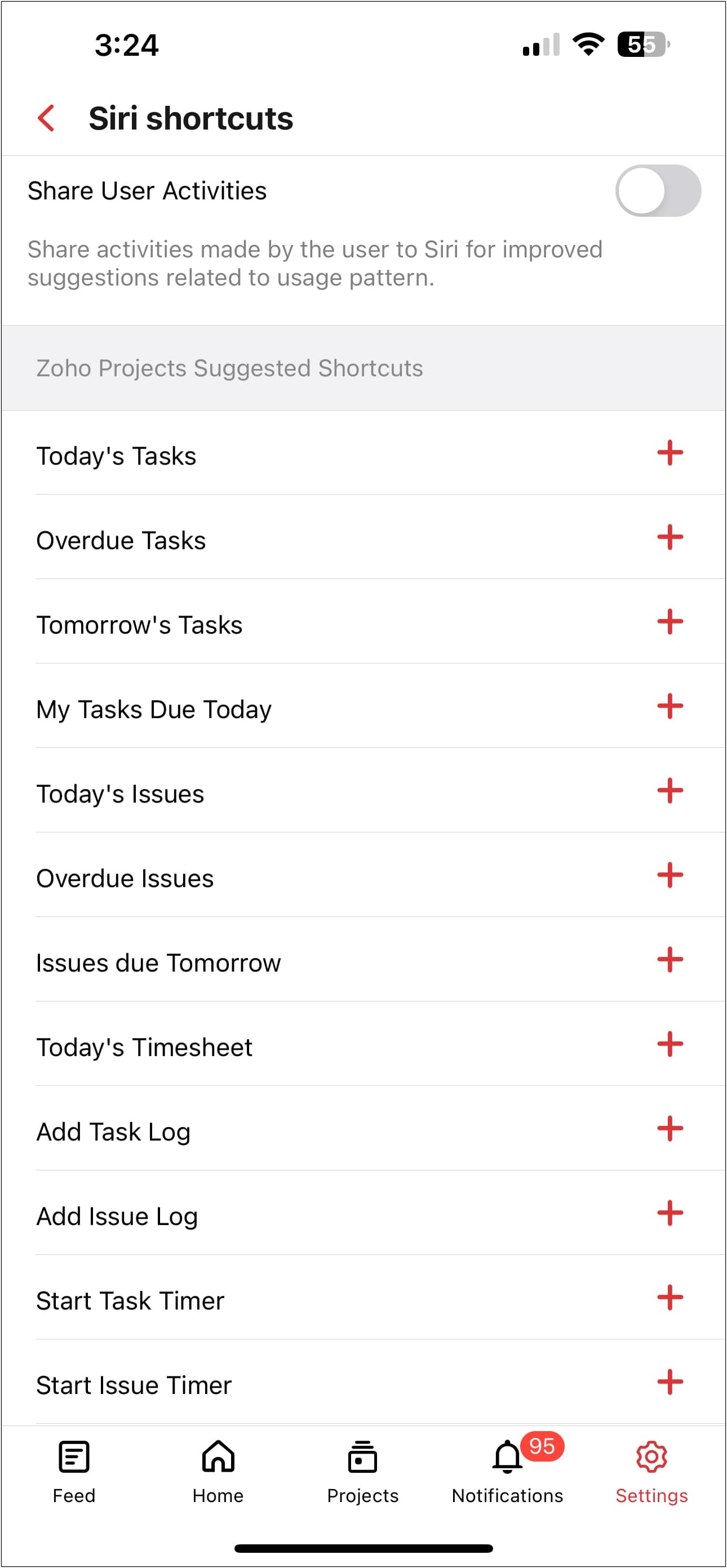 Zoho Projectsでは、Siriによる音声操作に対応しています。提案されたショートカットをSiriに追加することで、よく使う操作を音声ですぐに実行できます。追加方法は以下のとおりです。