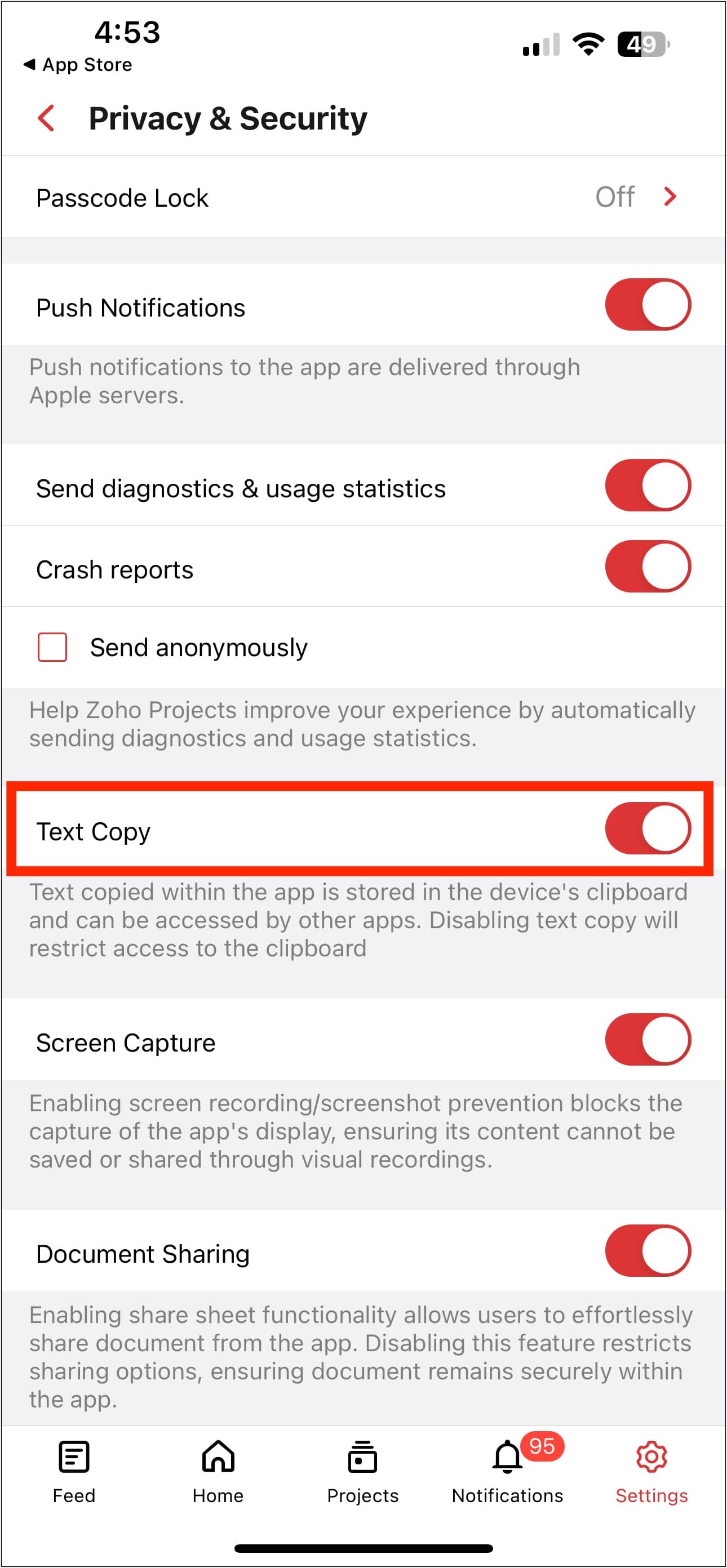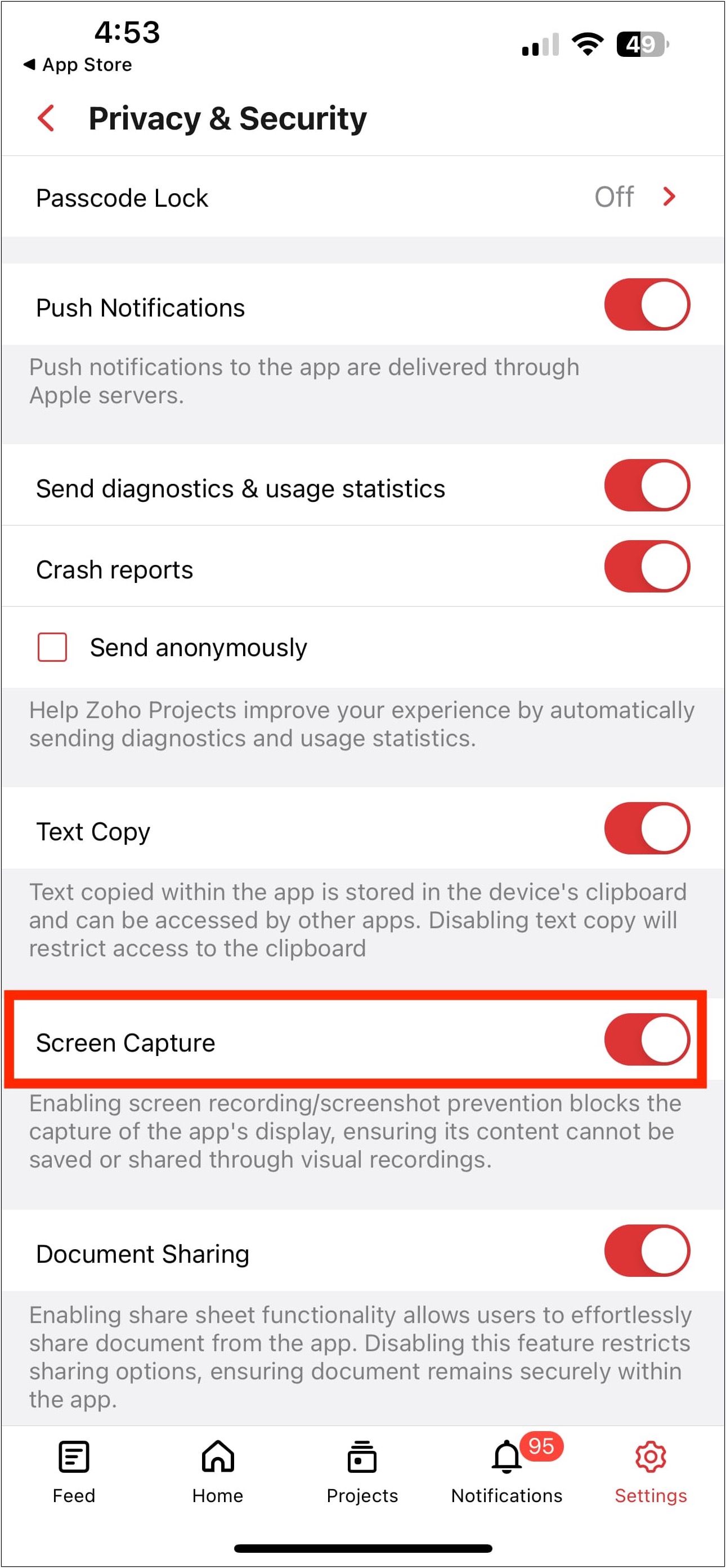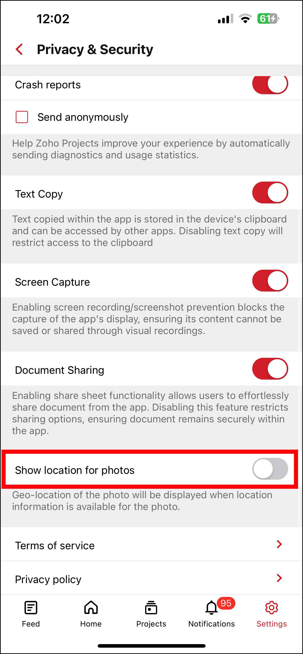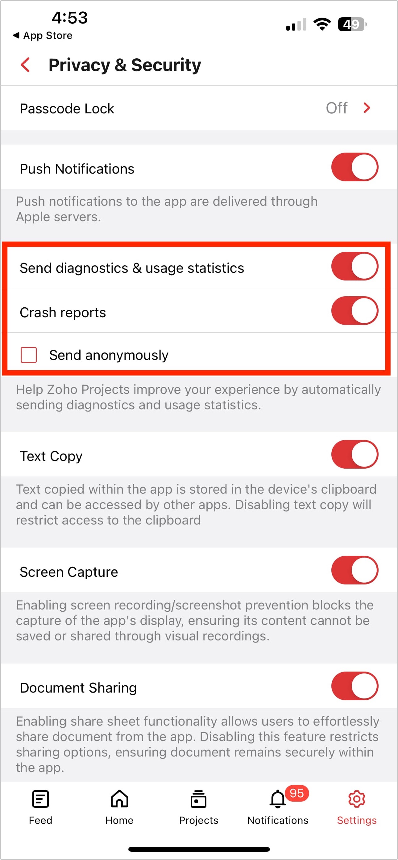 Zohoでは、ユーザーおよび顧客のプライバシーを最優先しています。そのため、以下の設定から、モバイルアプリのプライバシー設定を自分の好みに合わせて調整できます。