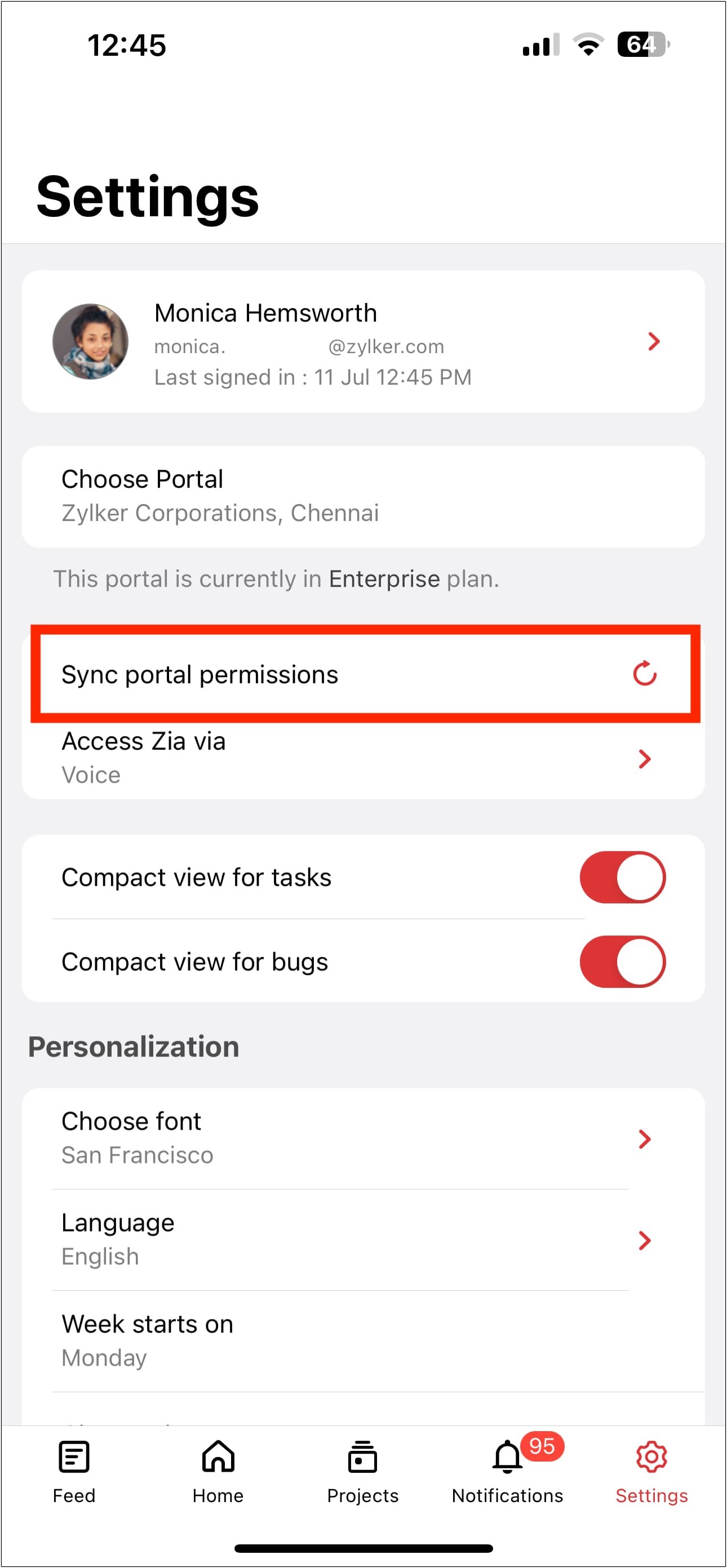Webアプリのポータル権限(例:タスク設定の変更)が変更された場合、その変更をモバイルアプリに反映させるには、ポータル権限を同期する必要があります。以下の手順で同期します。