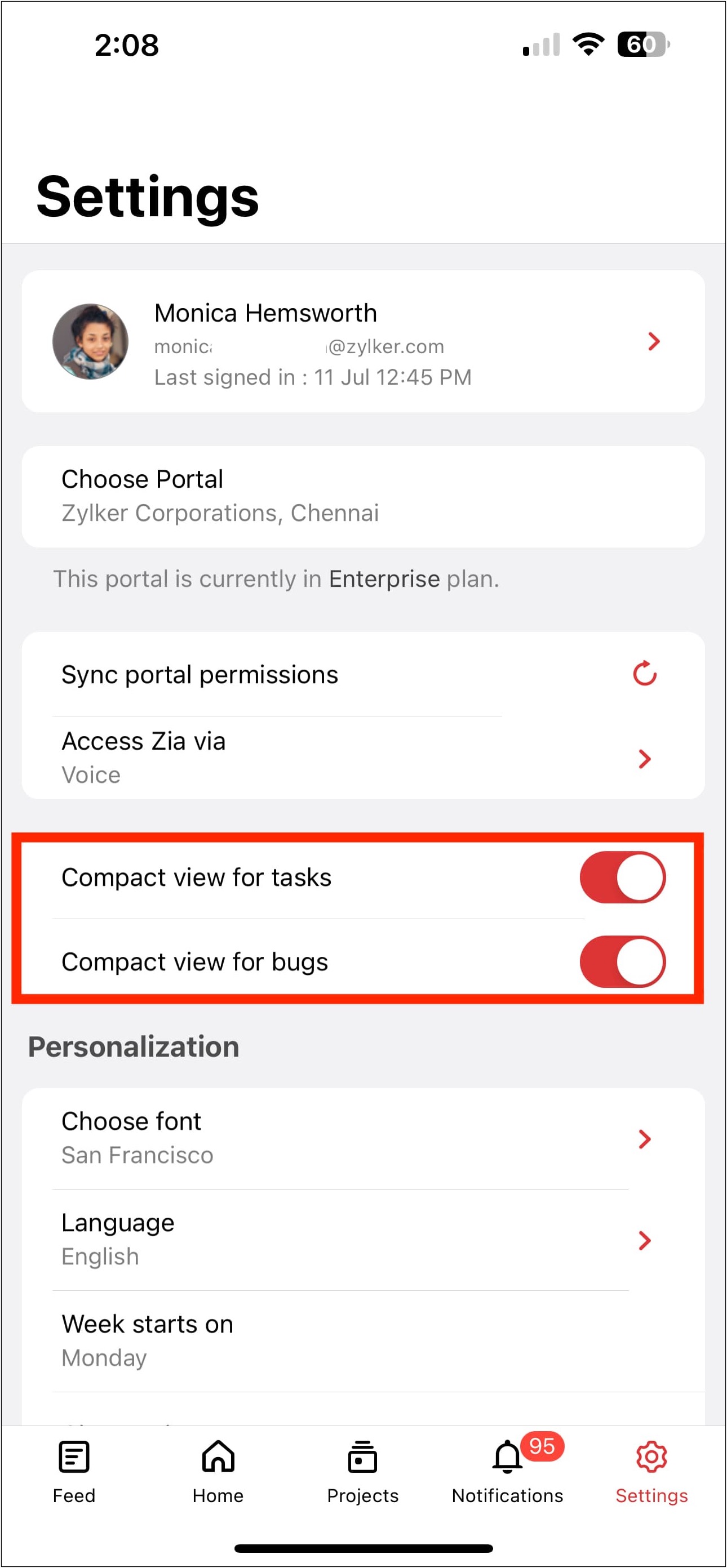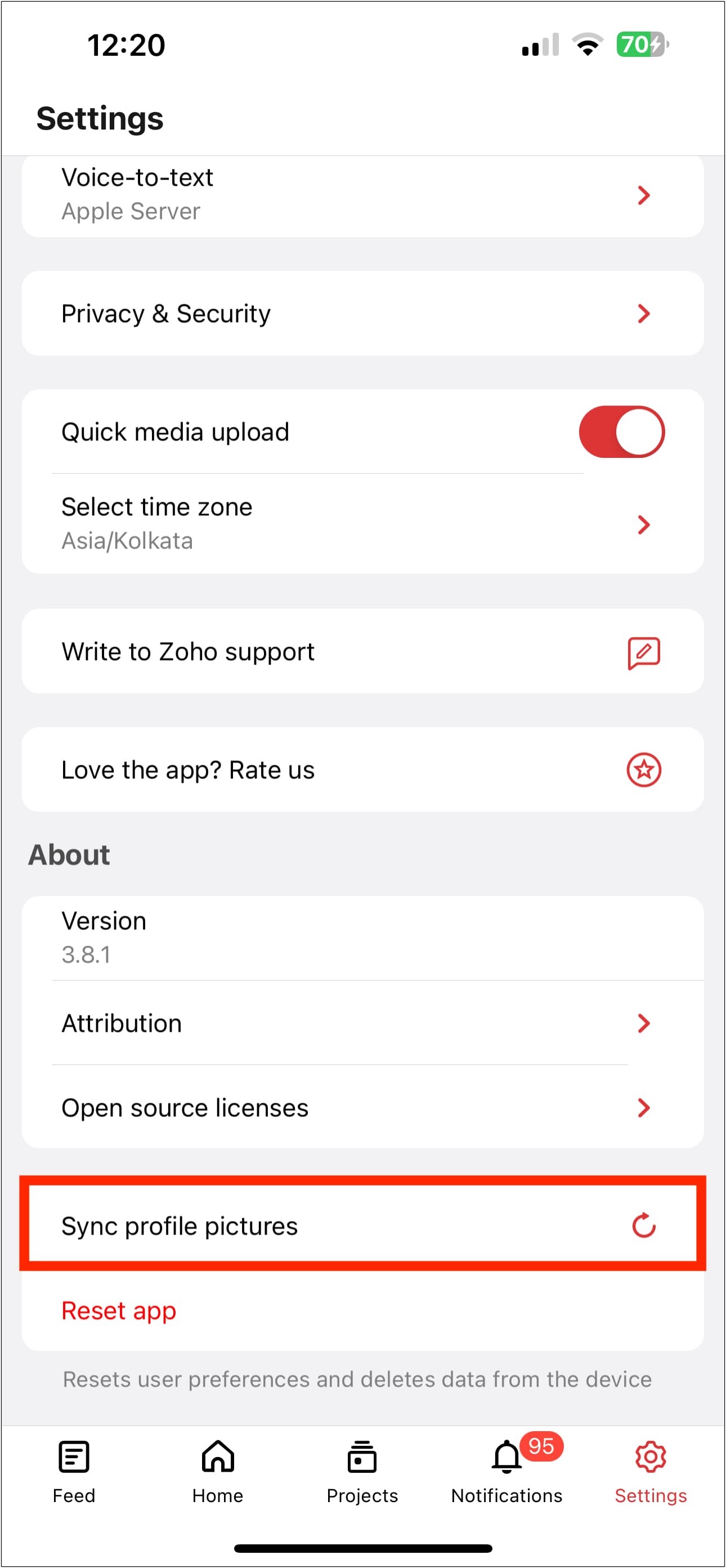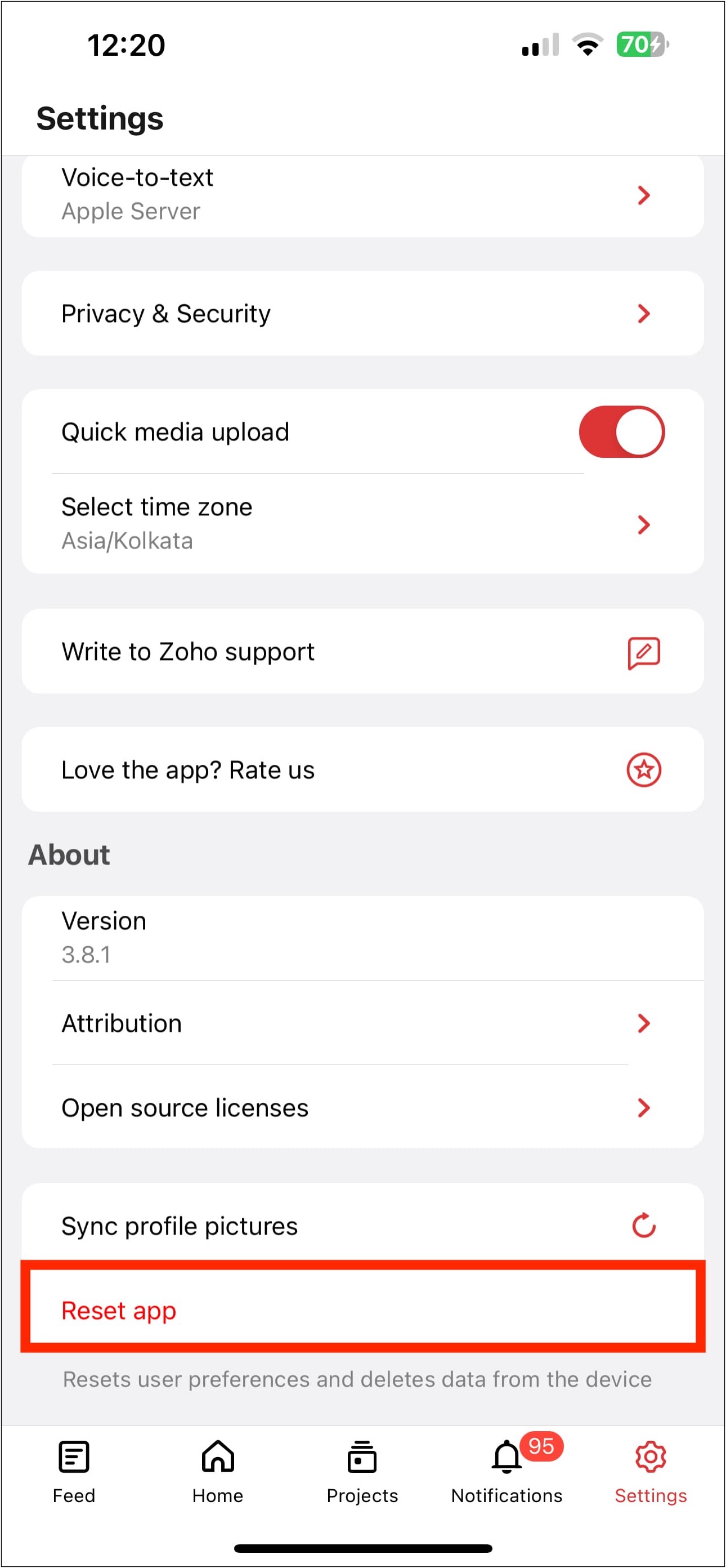 Zoho Projectsのモバイルアプリの設定は、モバイルアプリにのみ適用され、Webアプリの設定には影響しません。