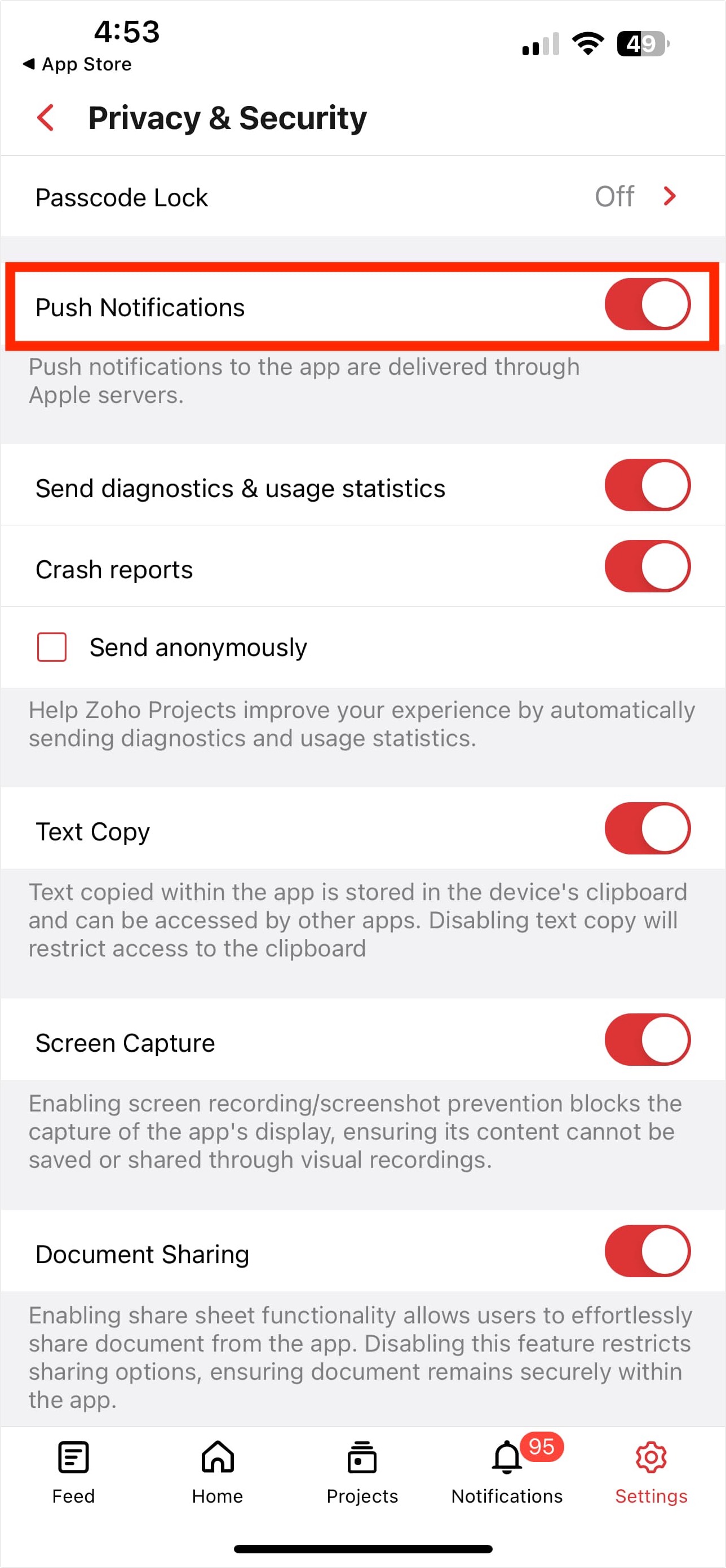 プッシュ通知を有効にしている場合にのみ、Zoho Projectsからの通知がモバイルデバイスに届きます。有効にするには、以下の手順を実行します。