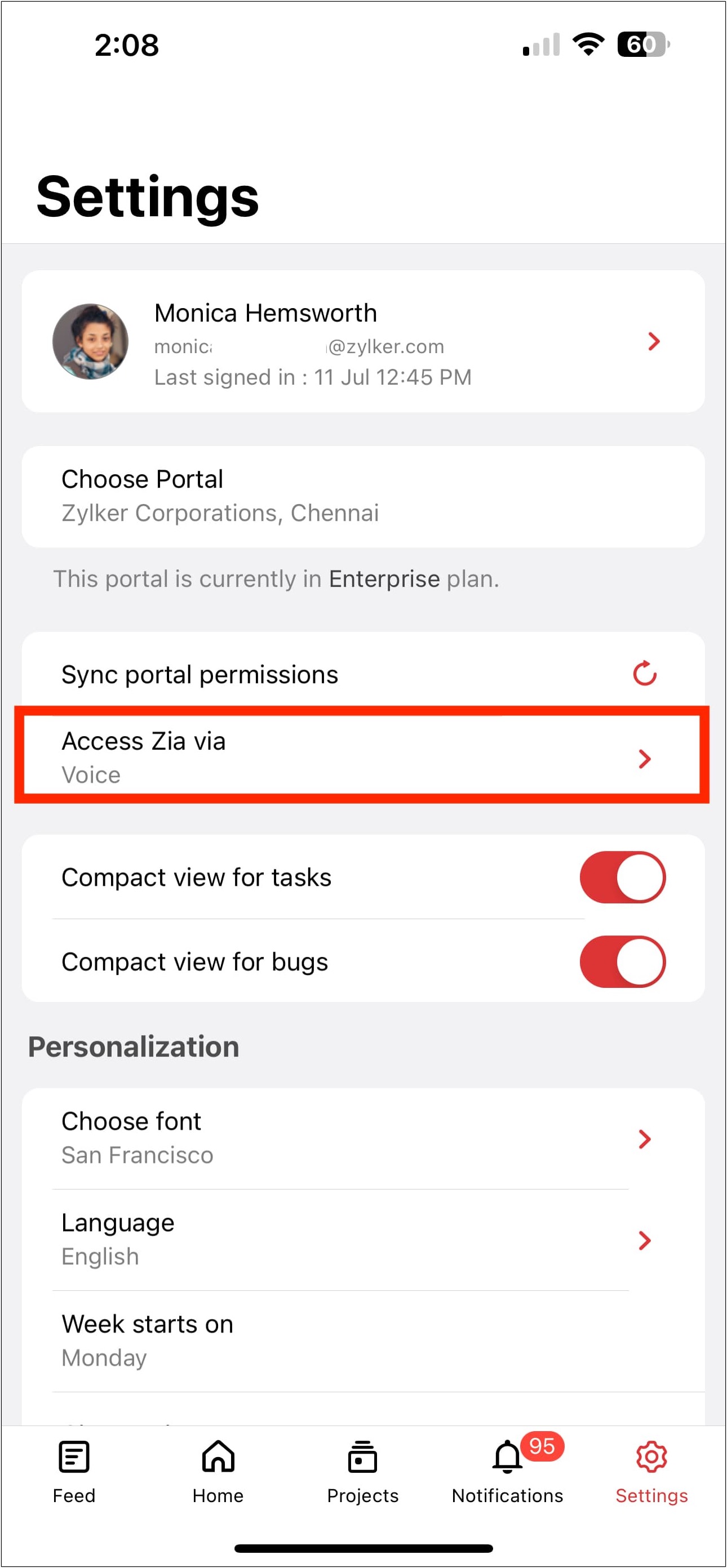 Zoho Projectsモバイルアプリの設定画面から、Ziaの利用方法として音声またはチャットを選択できます。