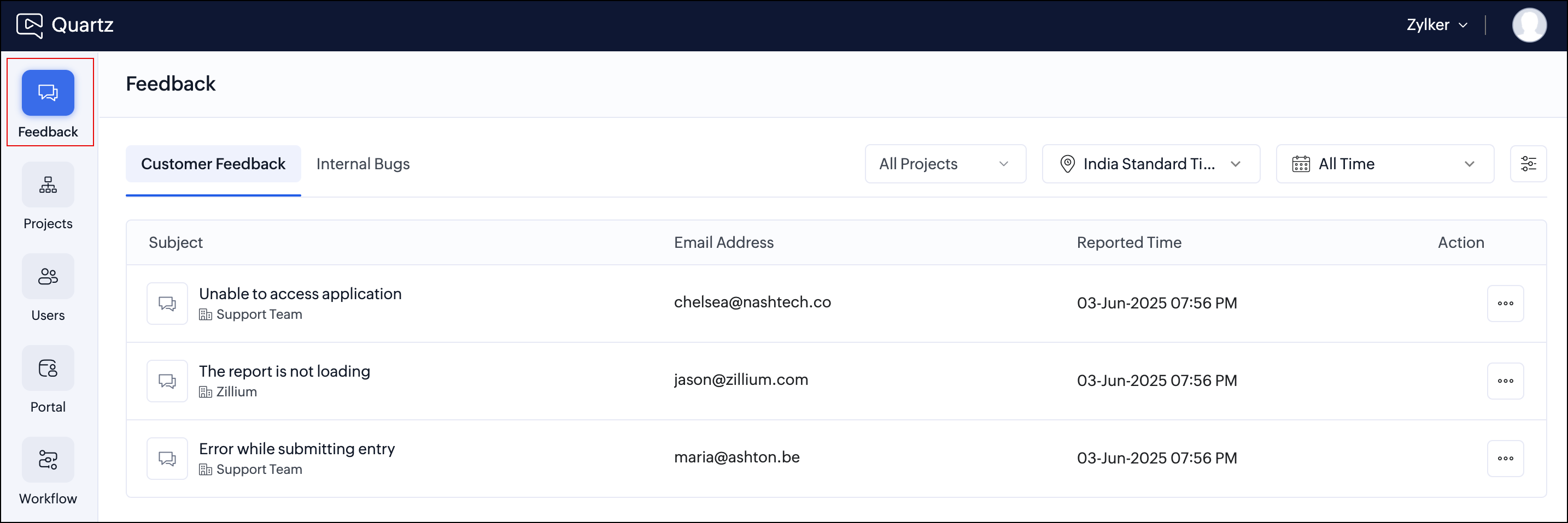 フィードバックは、顧客または社内従業員から送信され、発生している問題の画面録画および重要なパフォーマンス指標が含まれています。Zoho Quartzのフィードバックタブでは、パートナーがフィードバックを効率的に表示、管理、分析できます。これにより課題報告のプロセスが簡素化され、顧客のニーズに迅速かつ効果的に対応し、全体的なサービス品質の向上に役立ちます。