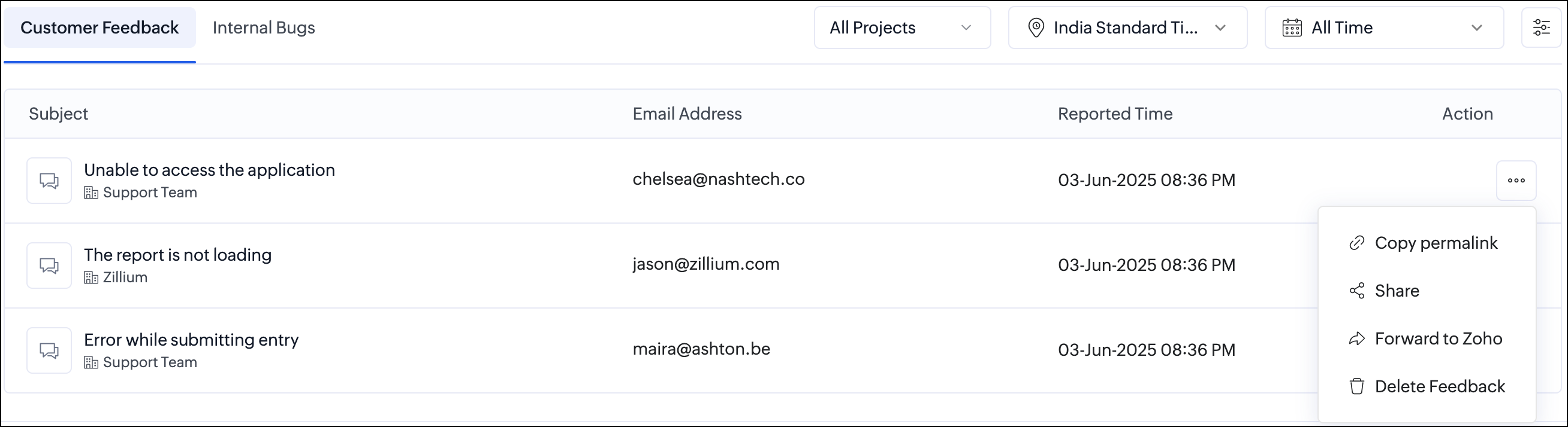 各フィードバックエントリーには、件名、プロジェクト名、メールアドレス、報告日時、実行可能な処理などの主要な詳細が表示されます。