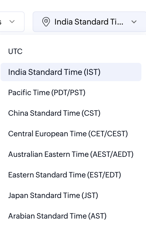 Zoho Quartz では利便性向上のため、タイムゾーンを変更できます。9つのタイムゾーン設定(UTC、Pacific、Arabian、Indian、Chinese、Japan、Central European、Australian Eastern、Eastern)から選択可能です。チームや顧客が異なる地域にいる場合の調整にも役立ちます。