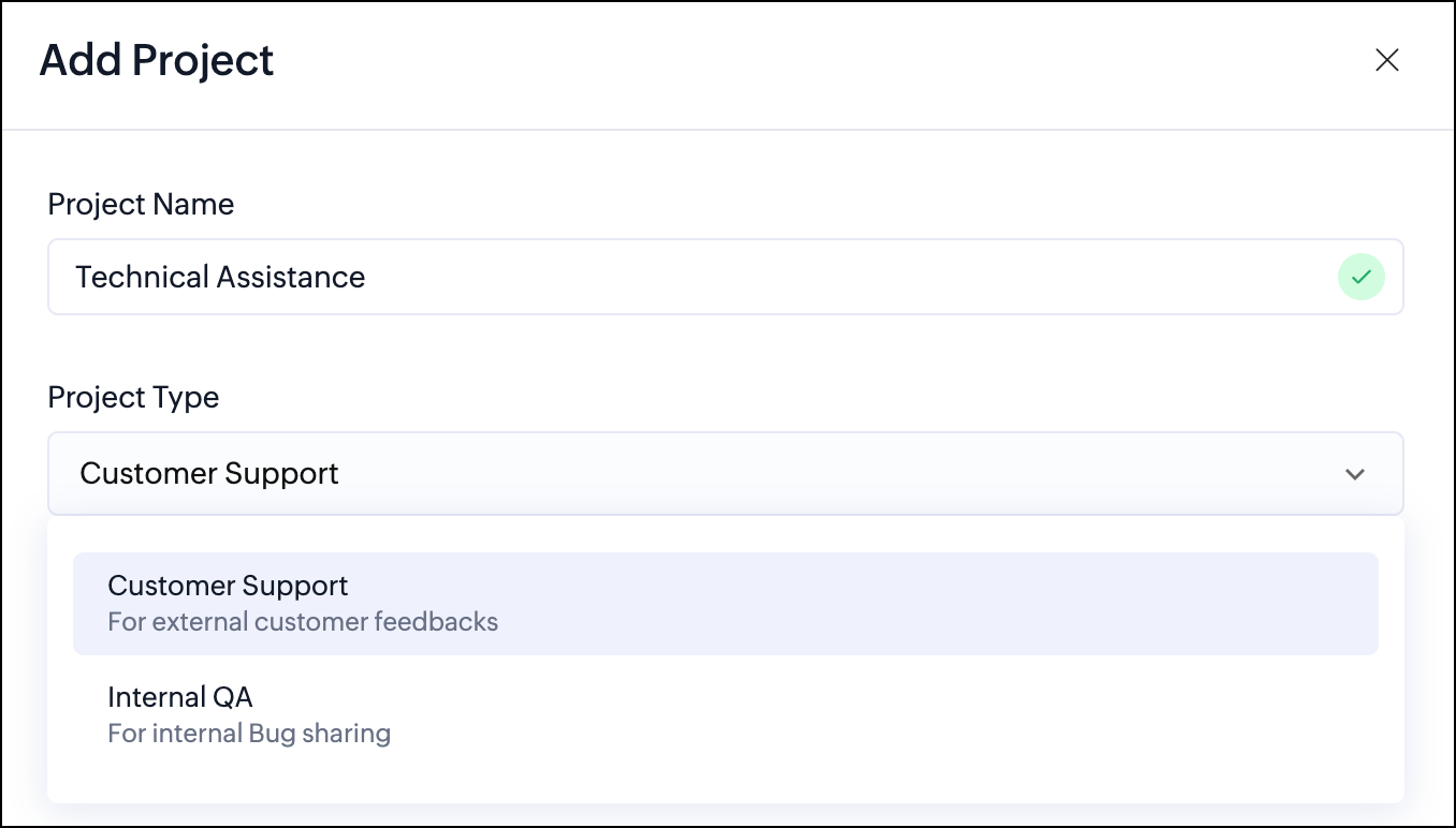 - その後、プロジェクト名の入力およびプロジェクト種類の選択を求められます。種類は「顧客サポート(外部フィードバック用)」または「Internal QA(社内バグ共有用)」から選択できます。
