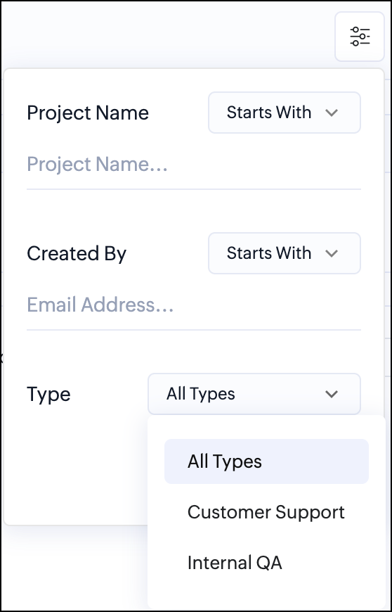 このページでは、さまざまな条件でプロジェクトをフィルターできます。プロジェクト名で検索したり、作成者のメールアドレスで絞り込むことも可能です。また、プロジェクト種類でのフィルターもできます。該当する条件を選択し、「適用する」をクリックしてください。