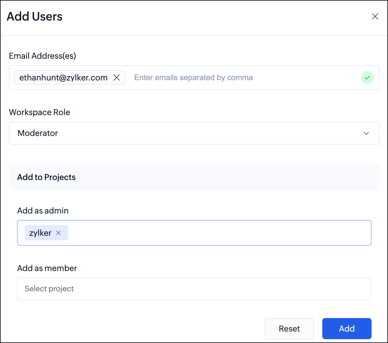 ユーザーを追加する際、管理者はユーザーが所属するプロジェクトを指定し、それぞれのプロジェクトで管理者またはメンバーの役割を割り当てることができます。