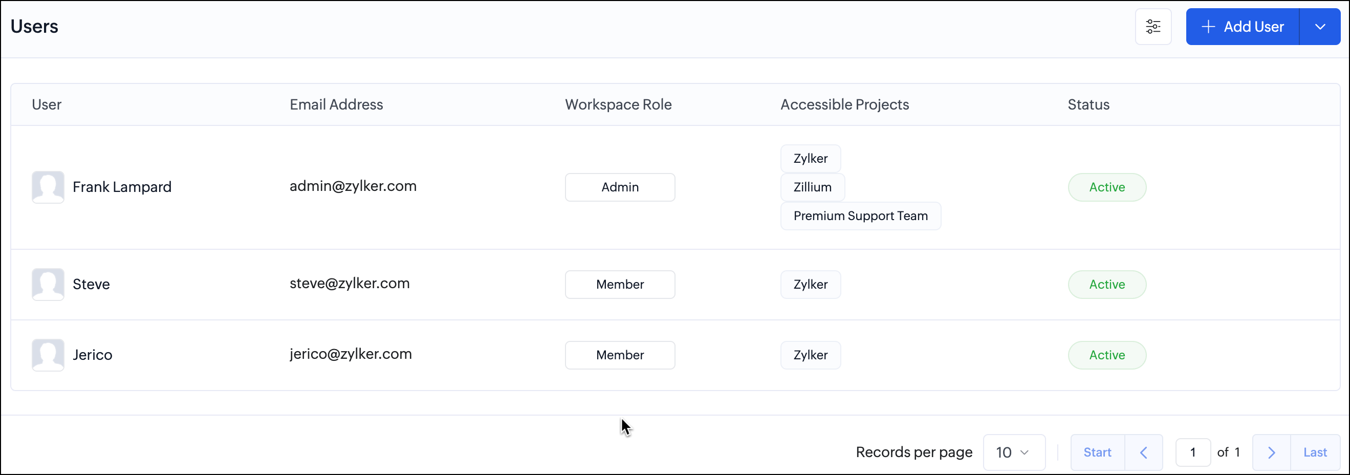 Zoho Quartzでは、管理者がワークスペース内で役割に基づくアクセス制御を設定できます。ユーザーページでは、管理者がワークスペース内のすべてのユーザーを一覧表示でき、メールアドレス、アクセス可能なプロジェクト、ステータスも確認できます。