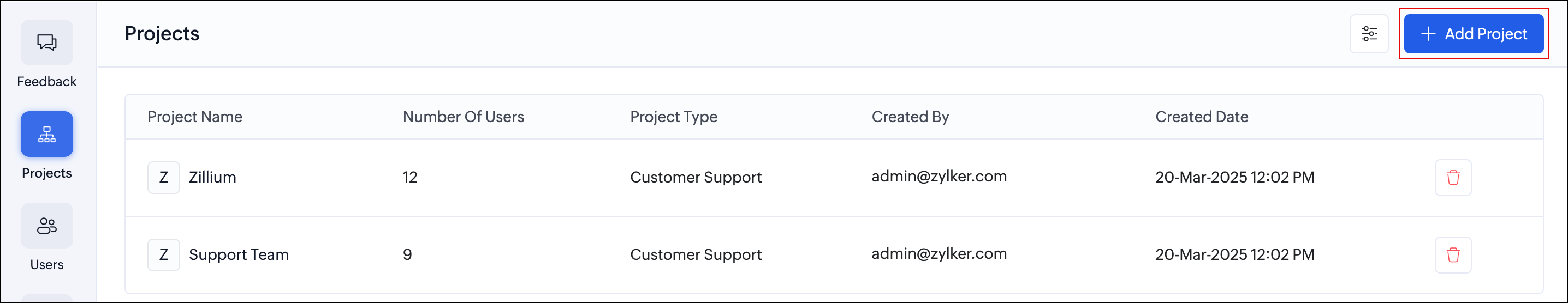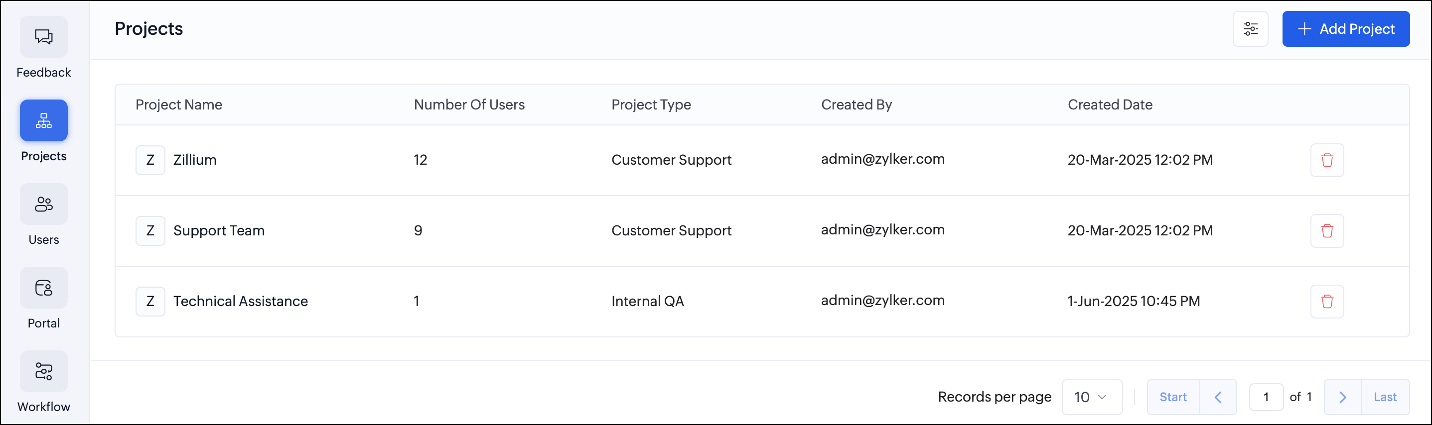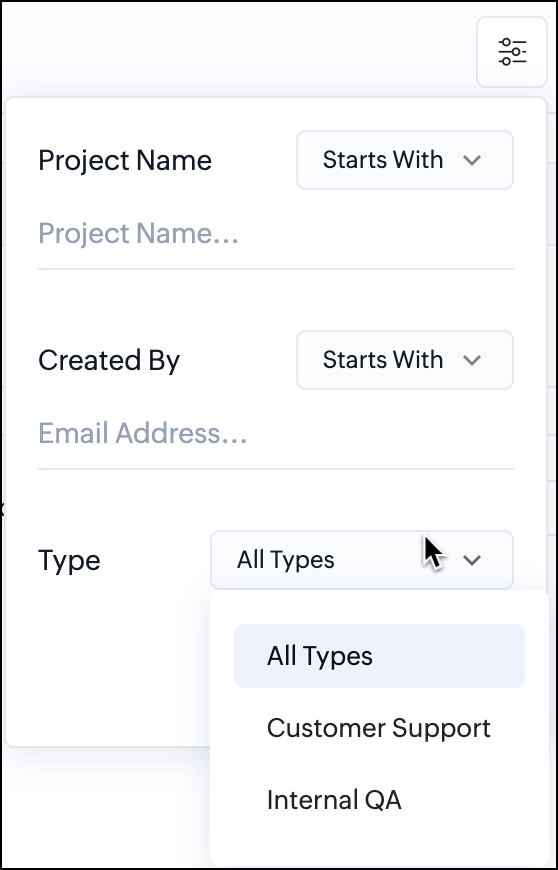 このページでは、さまざまな条件でプロジェクトをフィルターできます。プロジェクト名で検索したり、作成者のメールアドレスで絞り込むことも可能です。また、プロジェクト種類でのフィルターも行えます。該当する条件を選択し、「適用する」をクリックしてください。