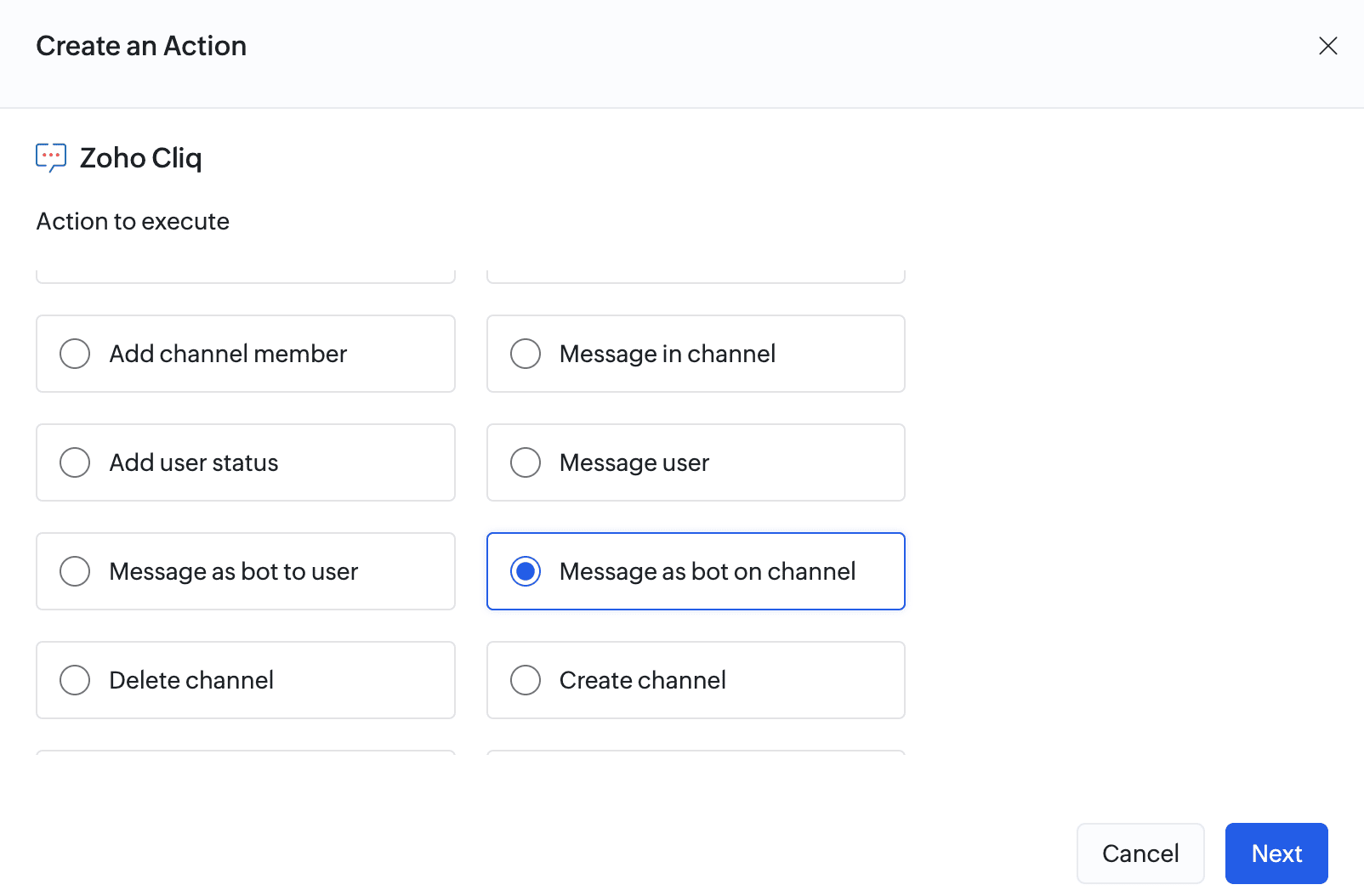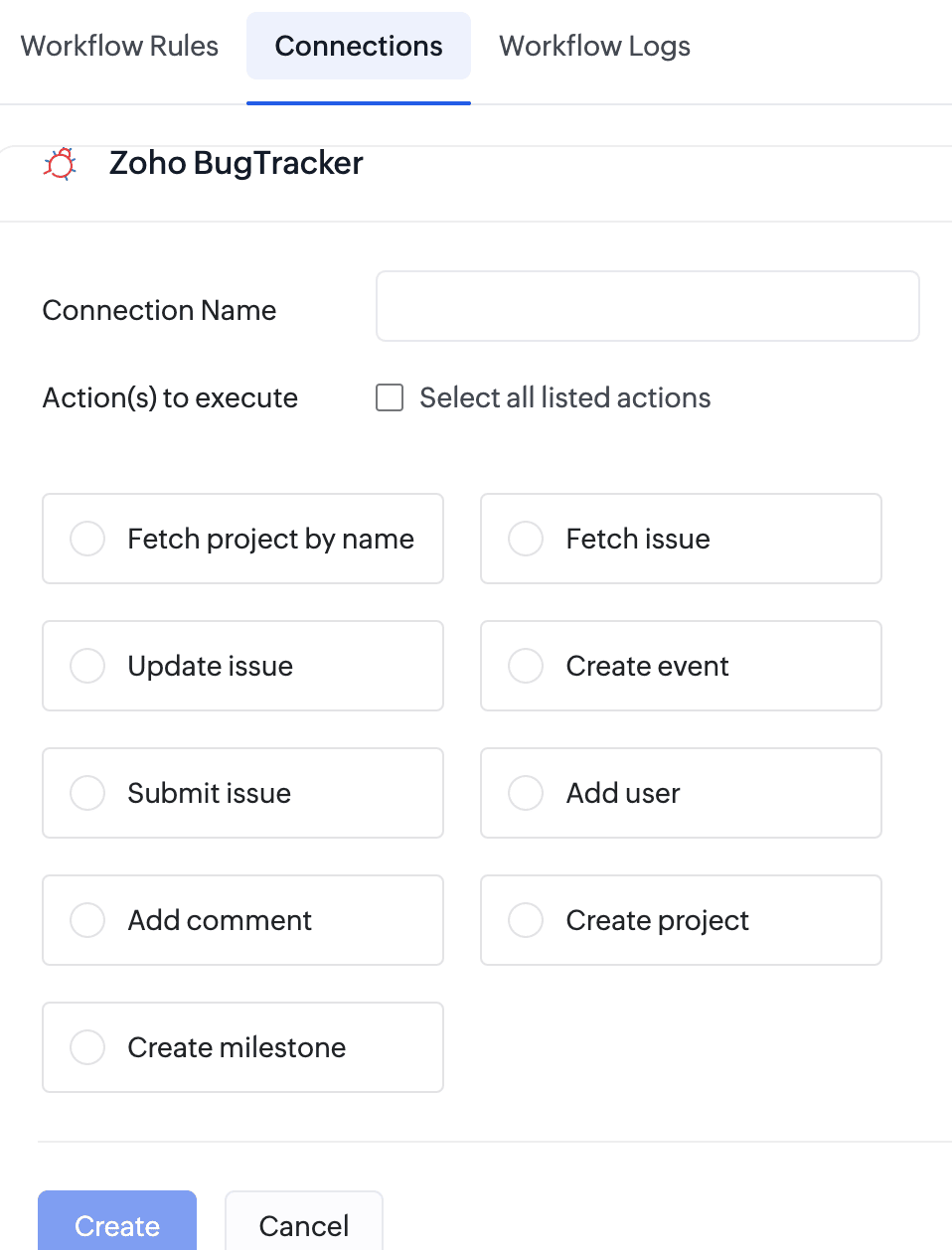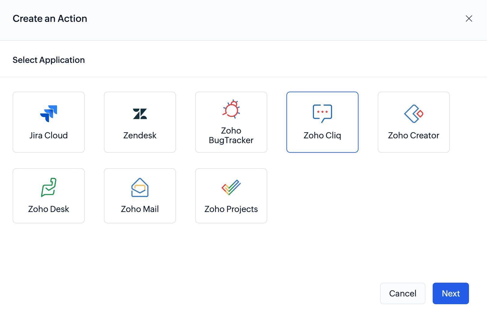 4. 処理セクションに移動します。ここで、追加する 操作をクリックし、Jira Cloud、Zendesk、Zoho BugTracker、Zoho Desk、その他のサードパーティツールに基づいて実行する処理を設定します。