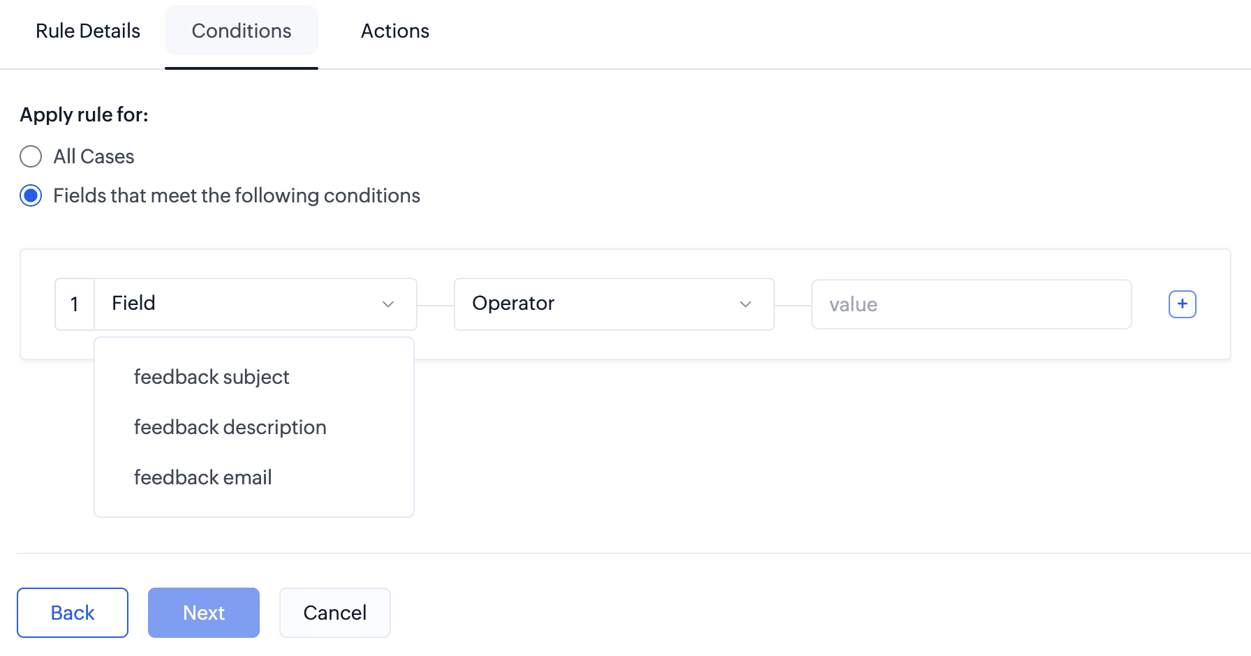 3. 条件セクションでは、ルールをいつ発動させるかを設定します。ルールはすべてのケースに適用することも、特定の条件を満たす項目のみに適用することも可能です。後者を選択した場合は、項目・演算子・値を指定してルールを発動させる条件を定義してください。をクリックします。