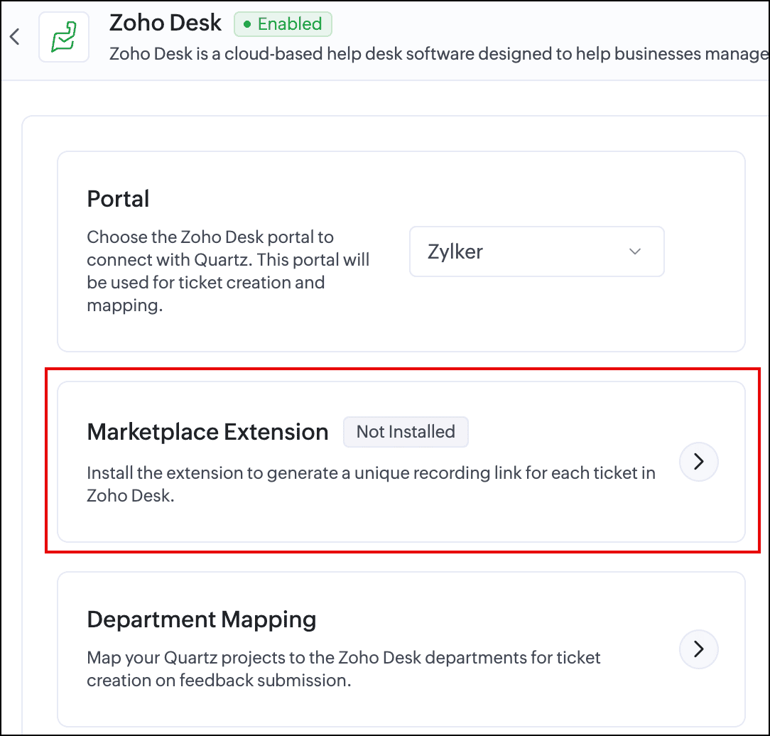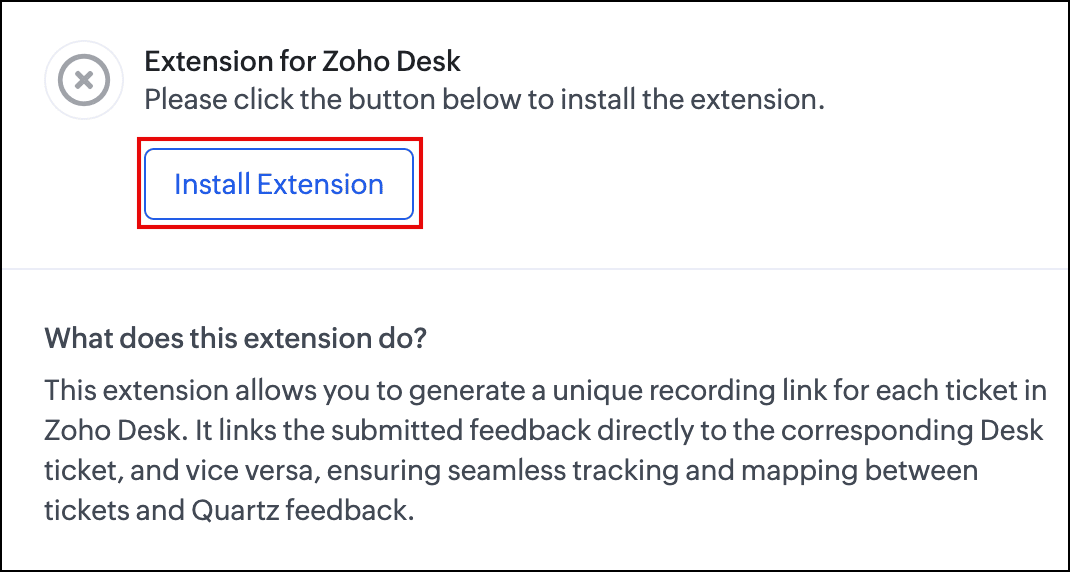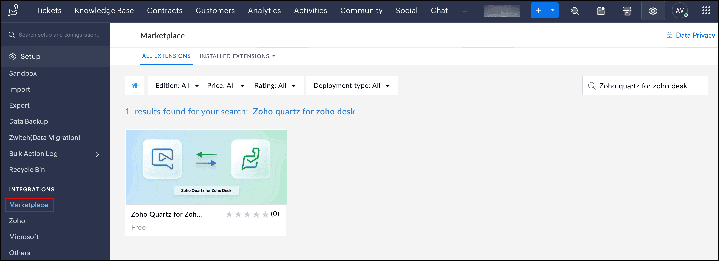- 'Zoho Quartz for Zoho Desk'を検索し、結果から拡張機能を選択します。