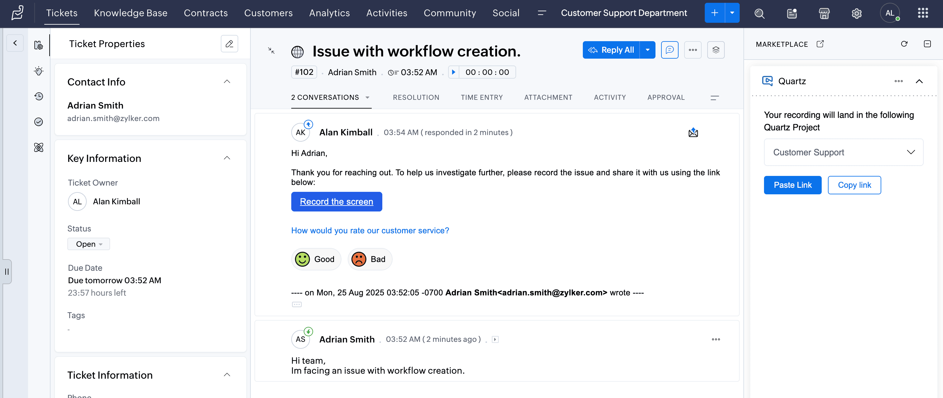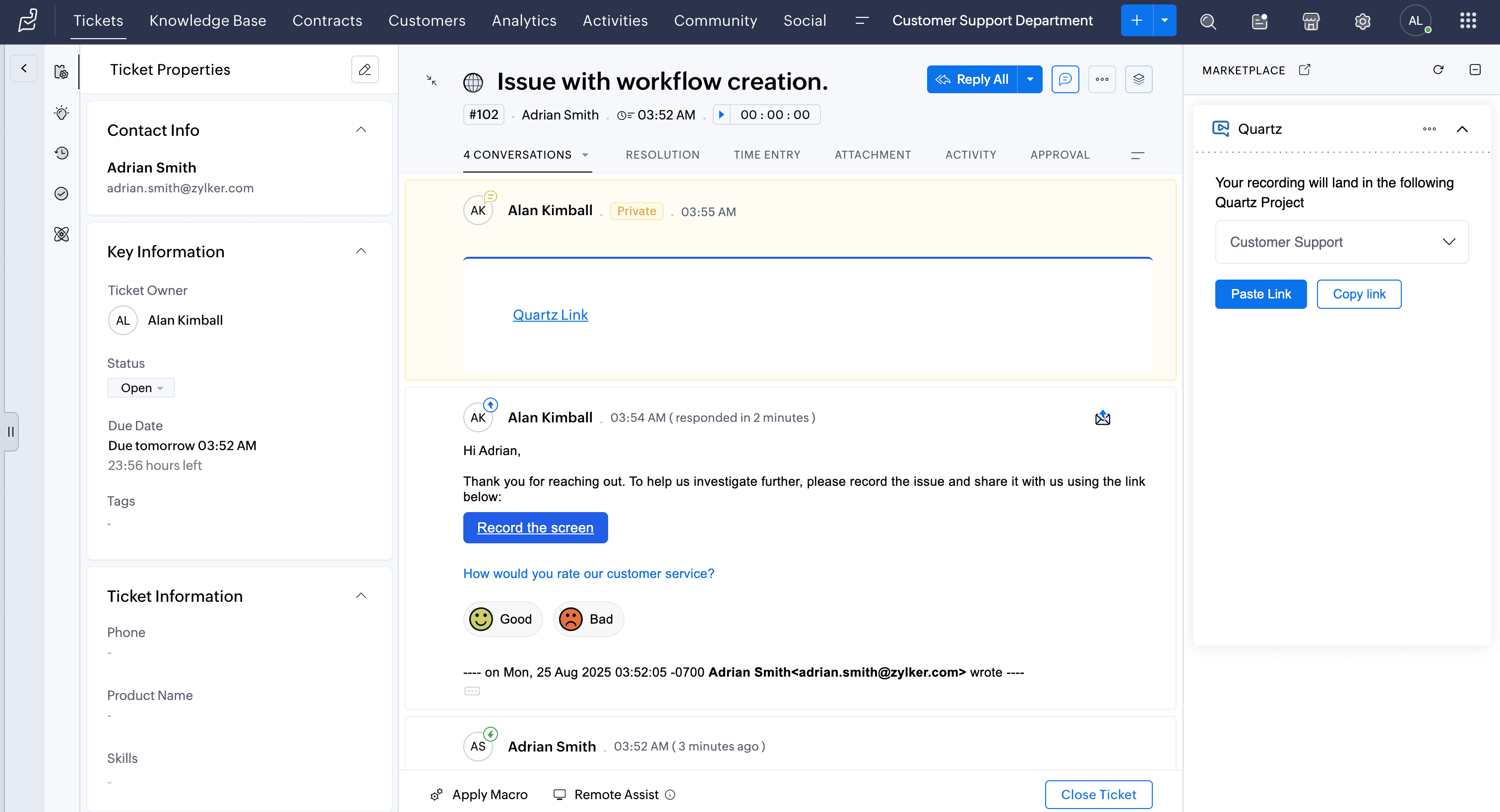 - 顧客の返信はZoho Deskチケットのスレッドに非公開コメントとして追加され、Quartzフィードバックリンクがチームの参照用に利用可能となります。