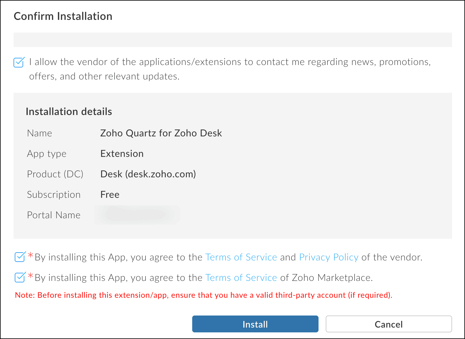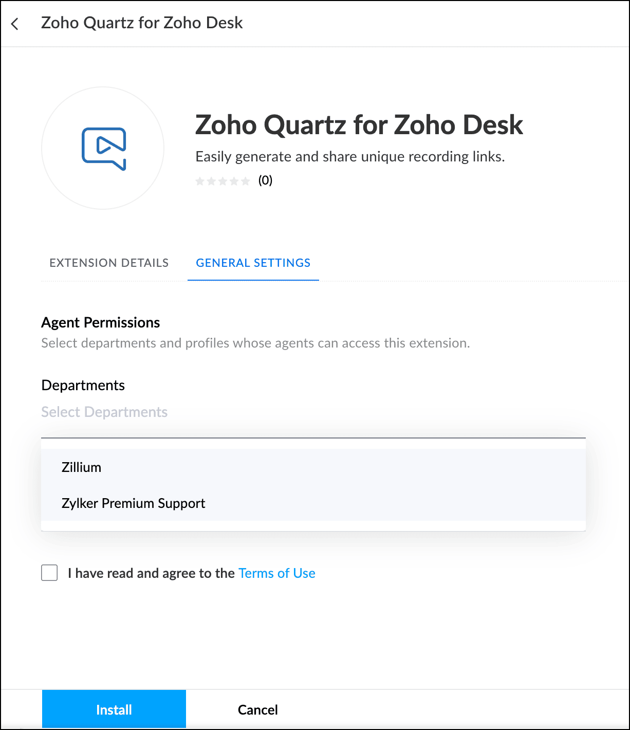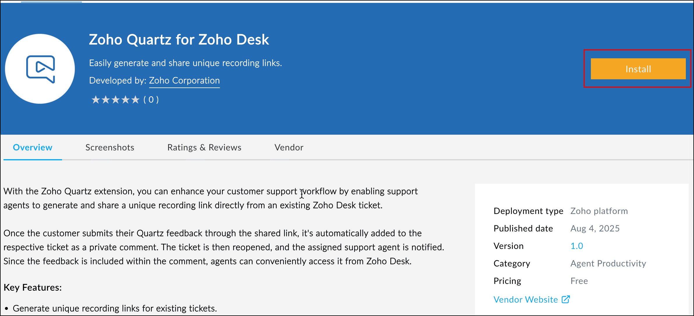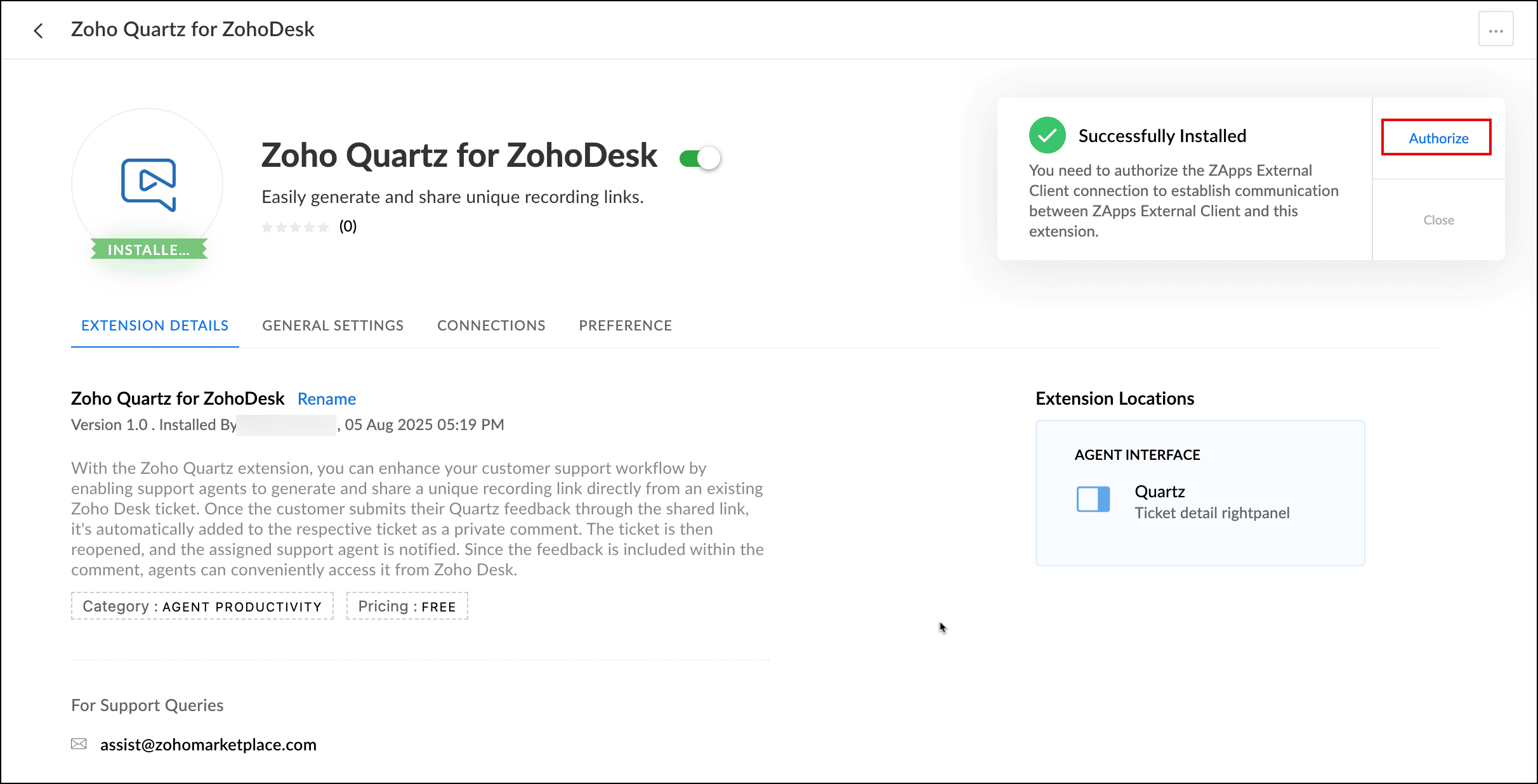 - Zoho QuartzおよびZoho Deskのいずれかの有料プランを利用中のユーザーがインストール可能