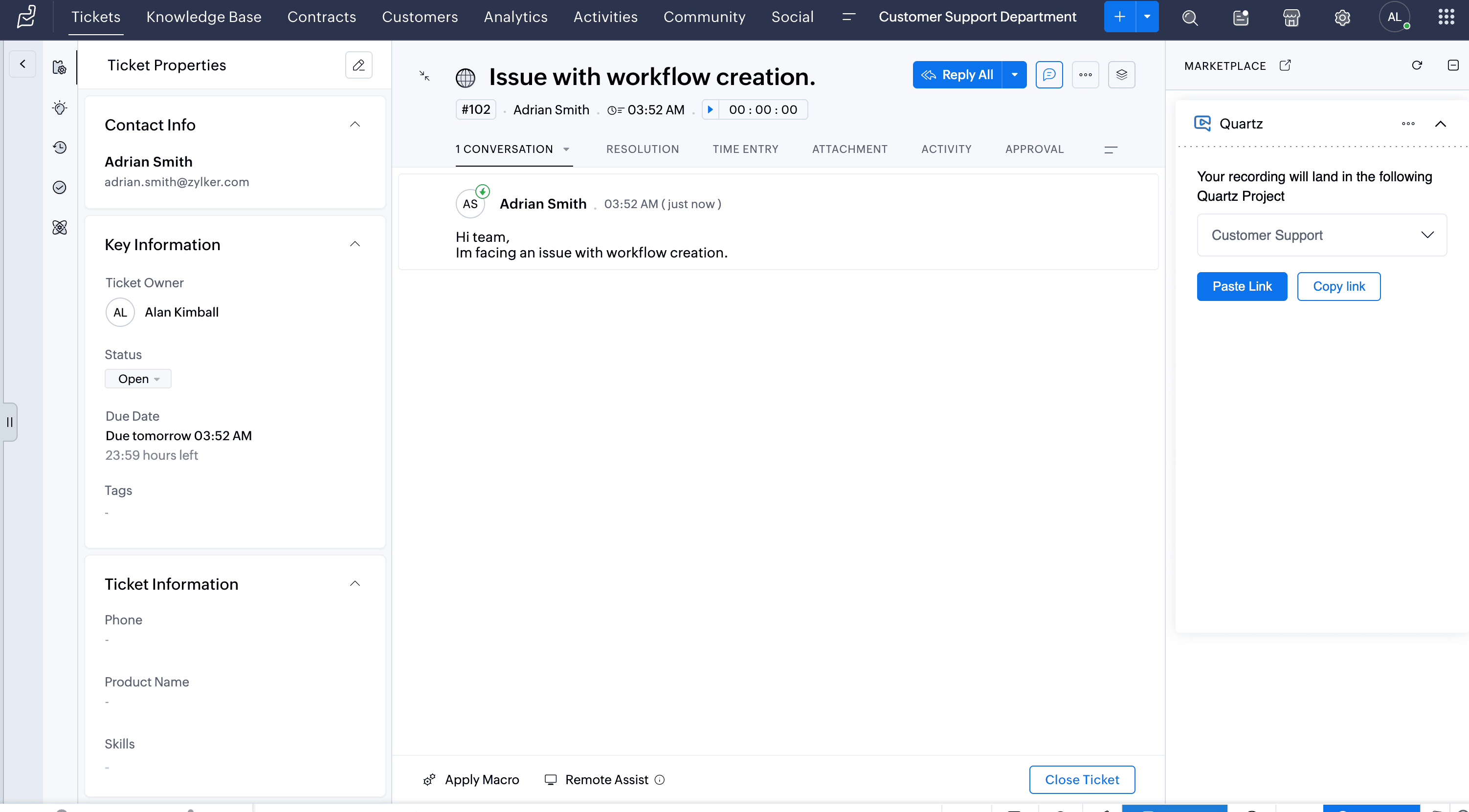 - Zoho Deskで任意のチケットを開きます。Zoho Quartzウィジェットが右側のペインに表示されます。
