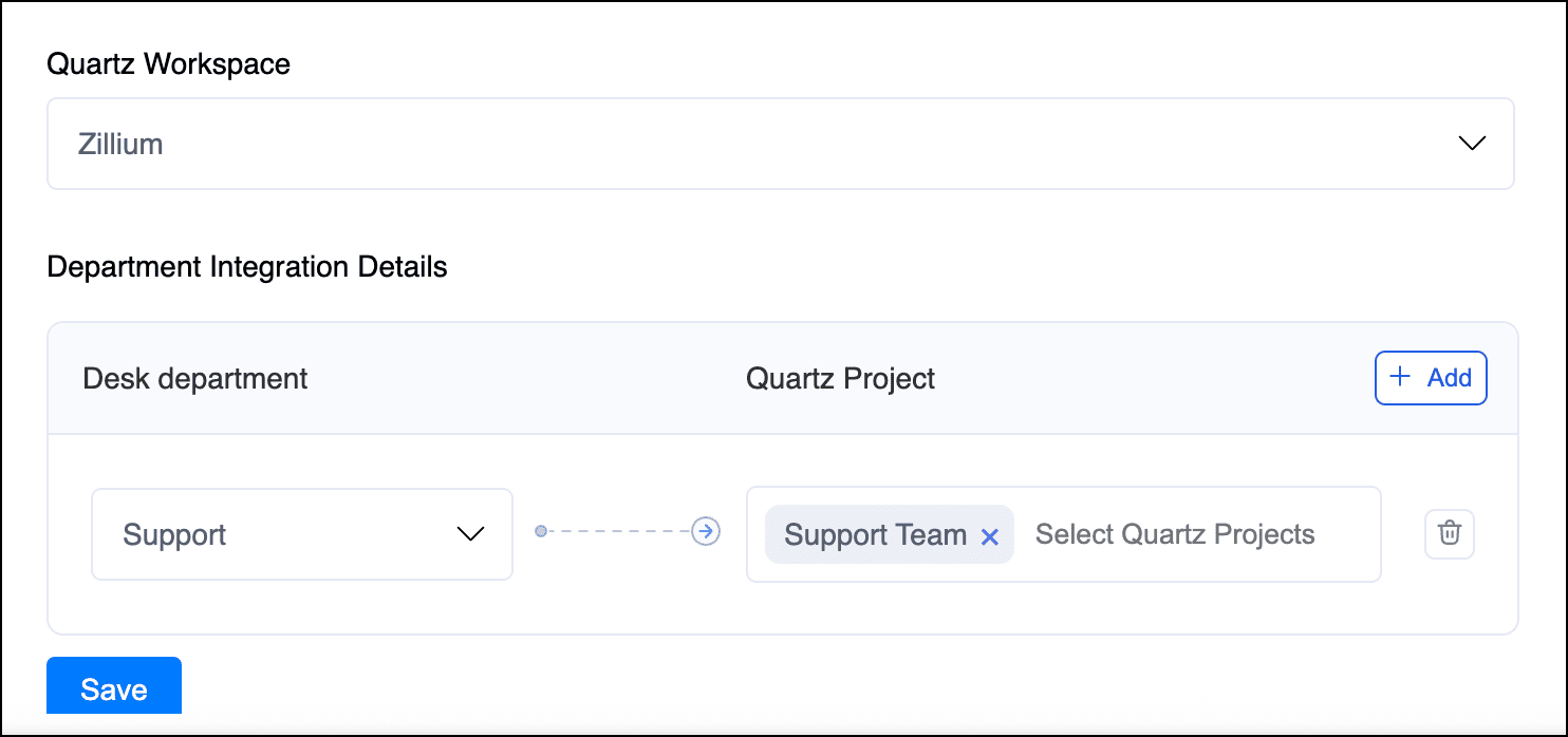 - 部署連携の詳細で、各Zoho Desk部署と対応するZoho Quartzプロジェクトをマッピングします。このマッピングにより、Quartzを通じて収集されたフィードバックが関連するサポート部署に正確に紐づけられます。