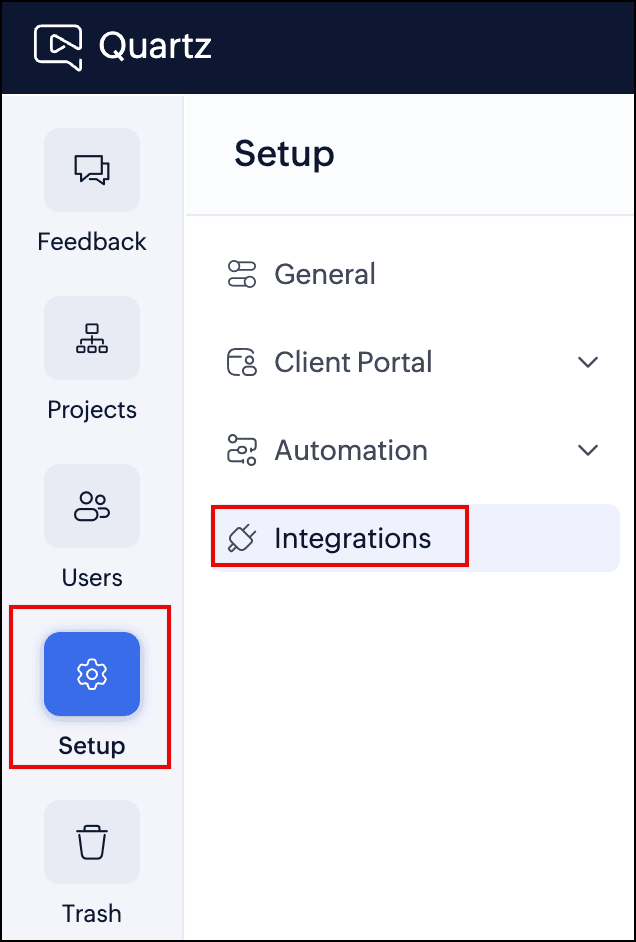- Zoho Quartzアカウントにログインします。ワークスペースに移動し、設定→Integrationsへ進みます。