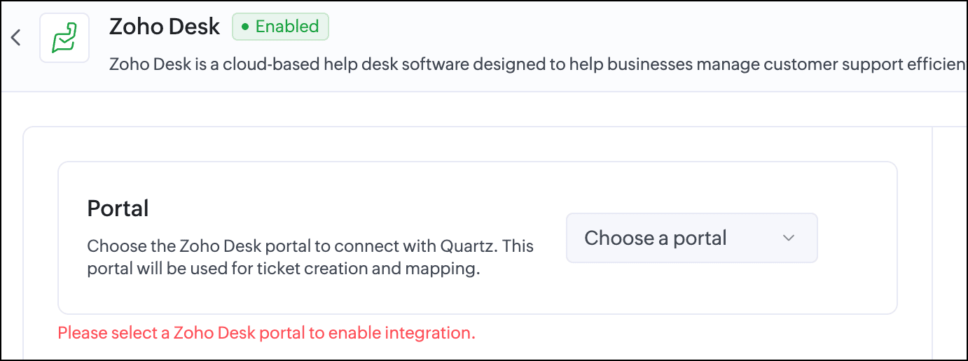 メモ:選択したQuartzワークスペースでZoho Desk連携が有効になっていない場合、エラーメッセージが表示されます。
