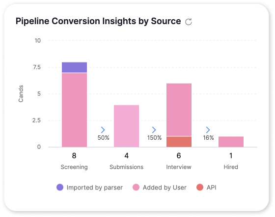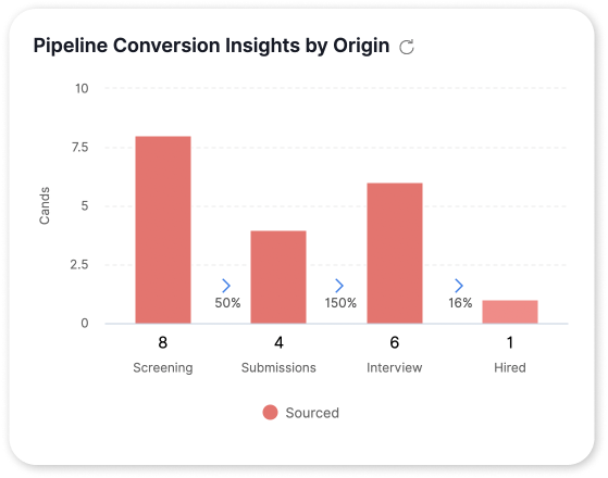 パイプライン転換インサイト(Origin別)は、候補者がパイプラインのあるステージから別のステージへ移動する数を測定します。この指標を用いて、Sourced、Referred、申請済みなど異なるOriginからの採用プロセスの効率を分析できます。パイプライン内のボトルネックを特定し、転換率向上のための最適化に役立つ重要な情報です。