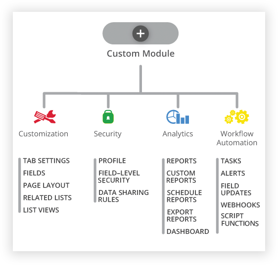 Zoho Recruitは、求人オープン、候補者、インタビューなどの採用活動のためのいくつかのデフォルトモジュールを提供しています。 これらのモジュールには、ページレイアウト、レポート、ワークフローオートメーションなどの事前定義されたビジネスロジックが含まれており、すべての要件を満たすためには、組織に固有のモジュールが必要になる場合があります。アカウント内の他の標準モジュールとリンクされている、ビジネスに関連するデータを格納する必要があります。