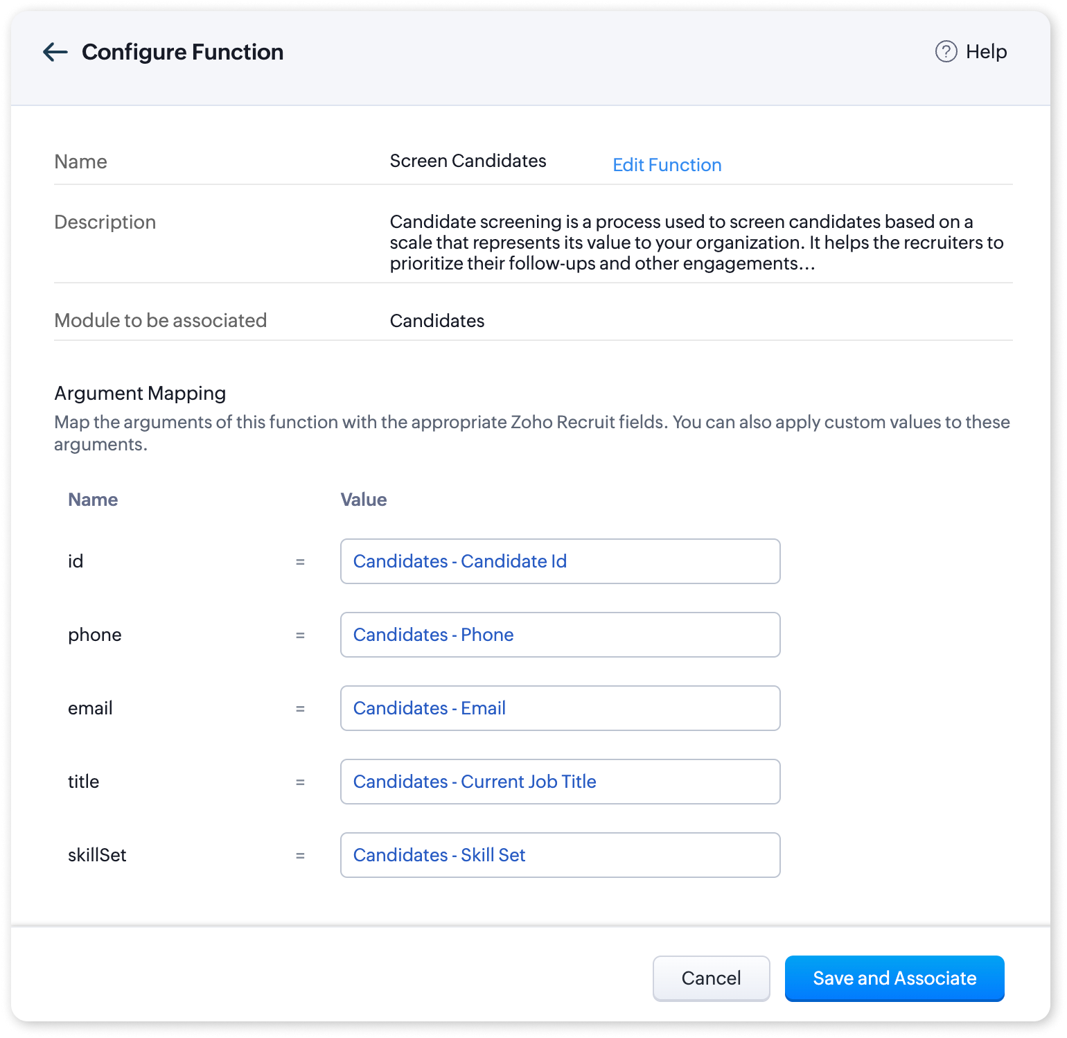 例として、Zylker Corp という企業では、様々な職種に対して多くのアプリケーションを受領しています。各候補者を手動でスクリーニングし、適性やフォローアップの優先順位を決めるのは時間がかかり、ミスも発生しやすくなります。このプロセスを効率化するため、Zoho Recruit では Screen Candidates カスタム関数を提供しています。この関数は、電話番号・メールアドレス・職務名・スキルセット・業界の詳細など、あらかじめ定義された基準に基づき、スクリーニング作業を自動化します。