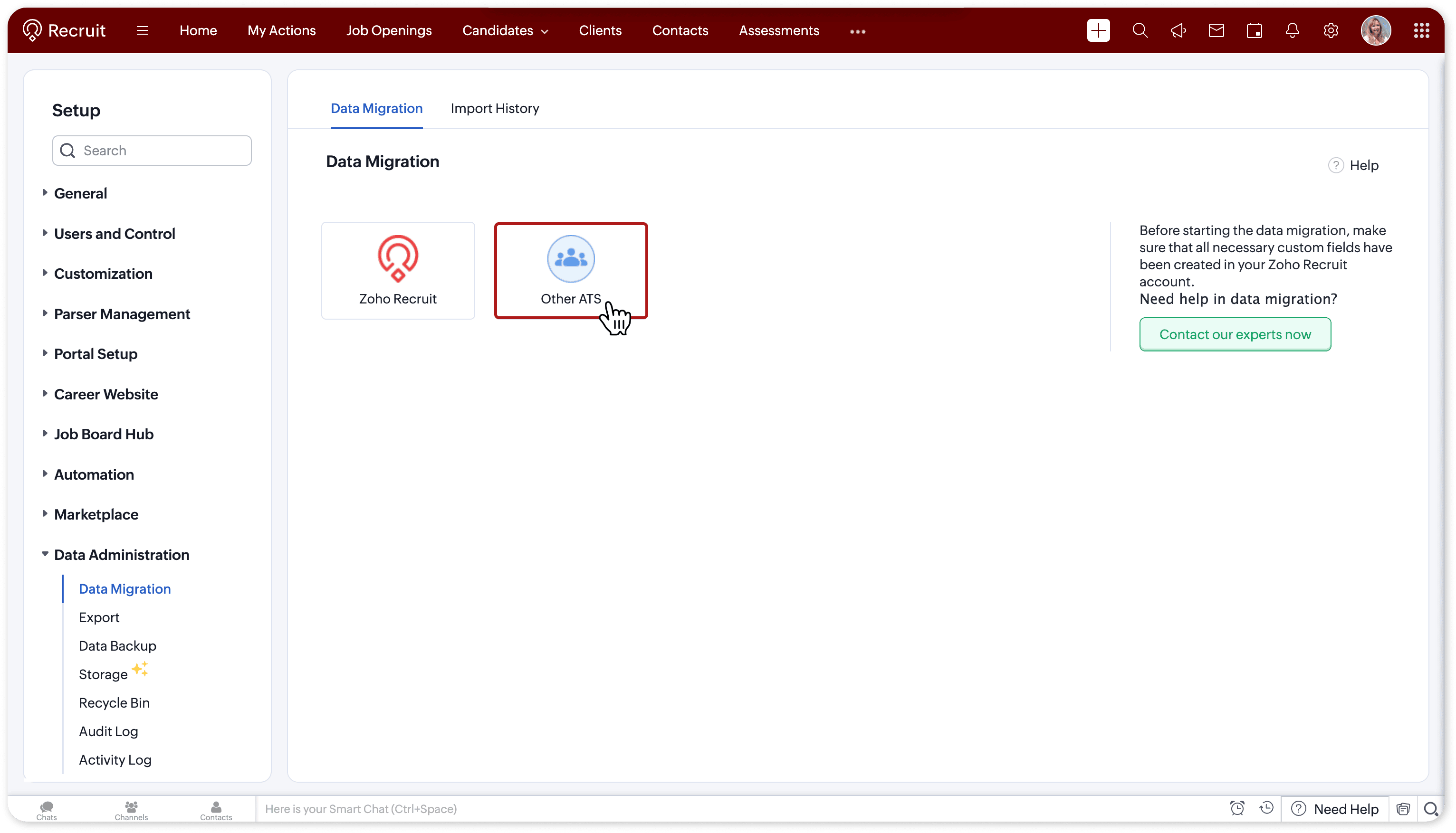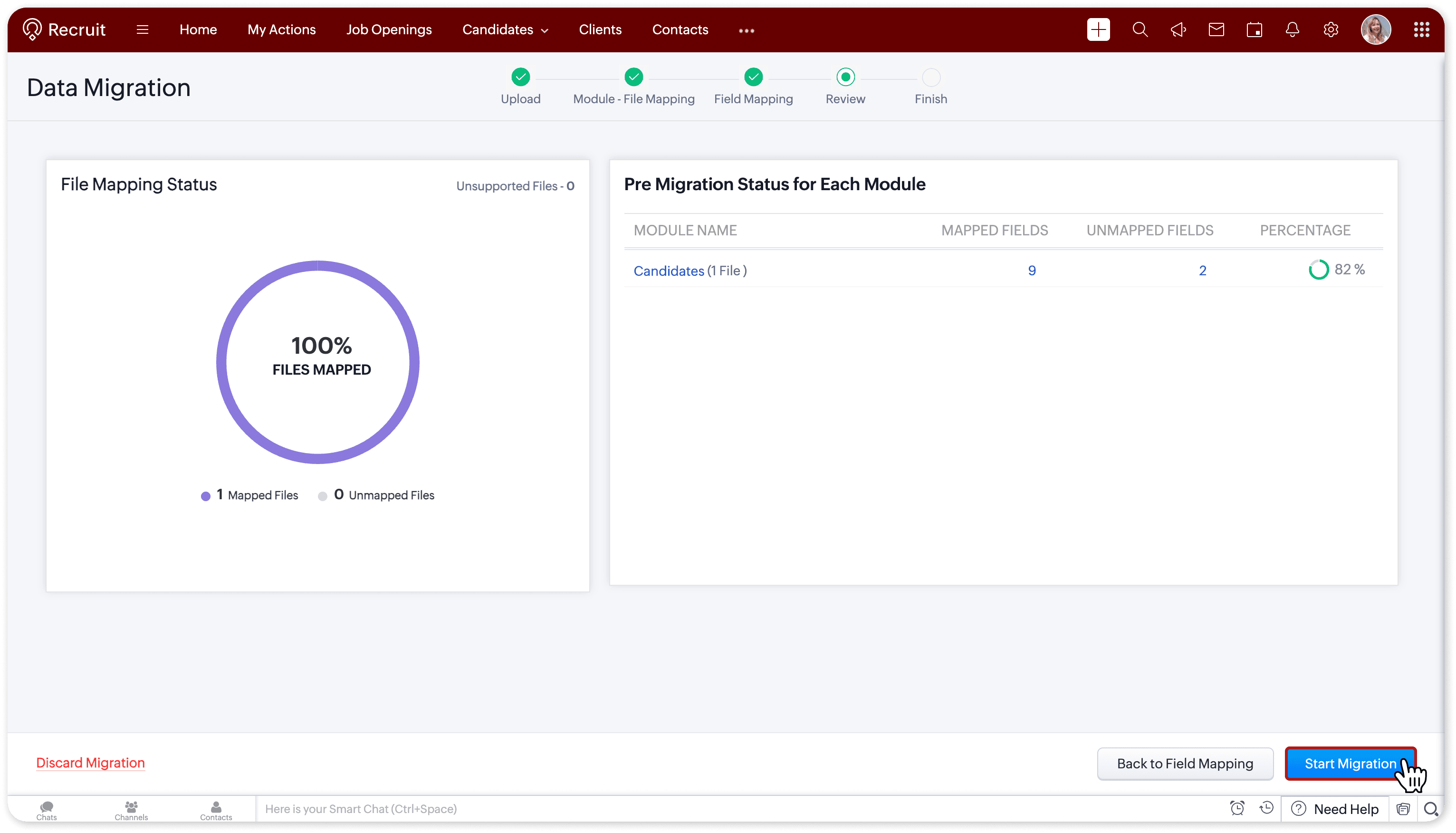 Zoho Recruit アカウントまたは他の ATS へのデータ移行を開始するには、移行を開始 をクリックします。