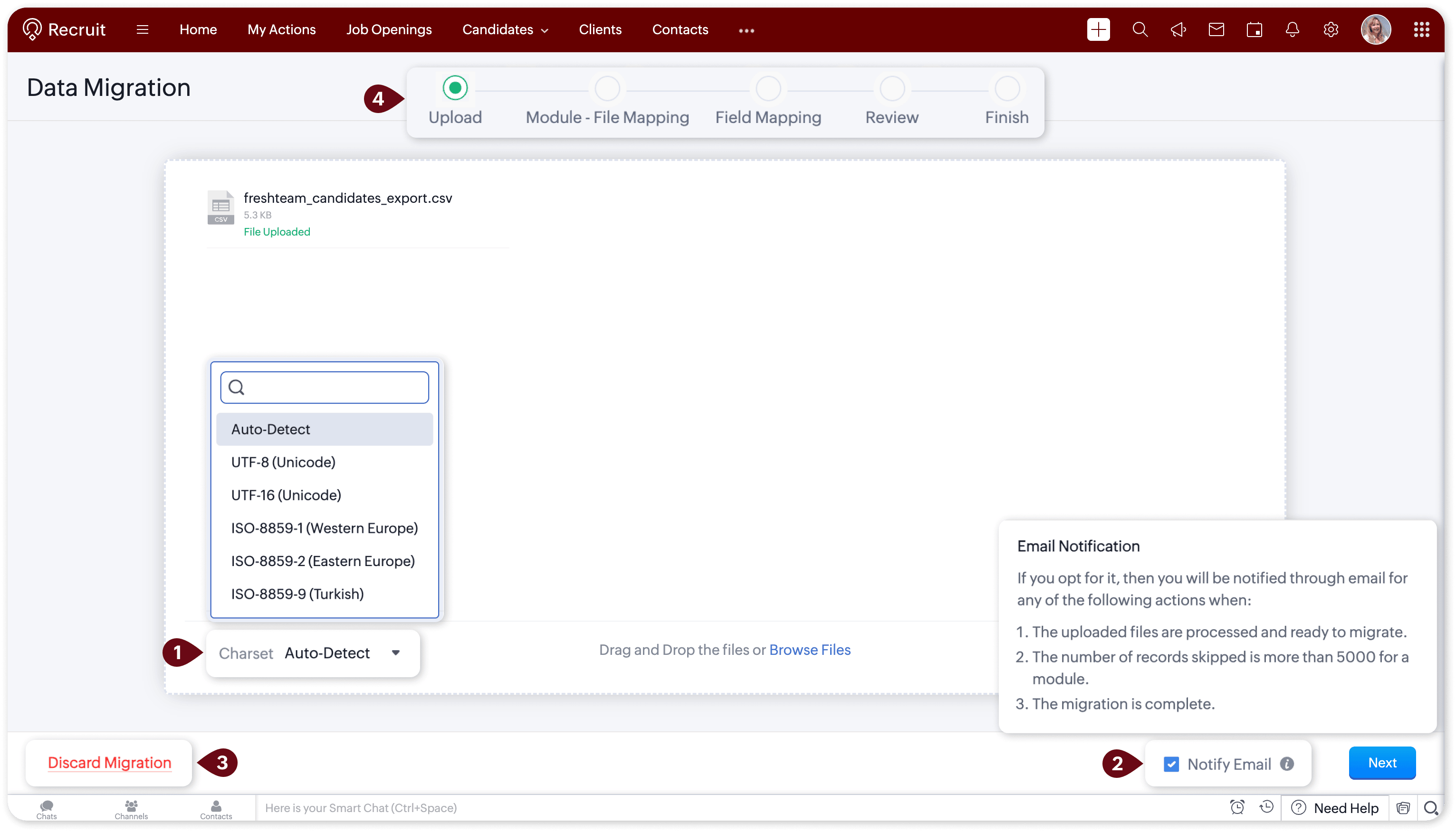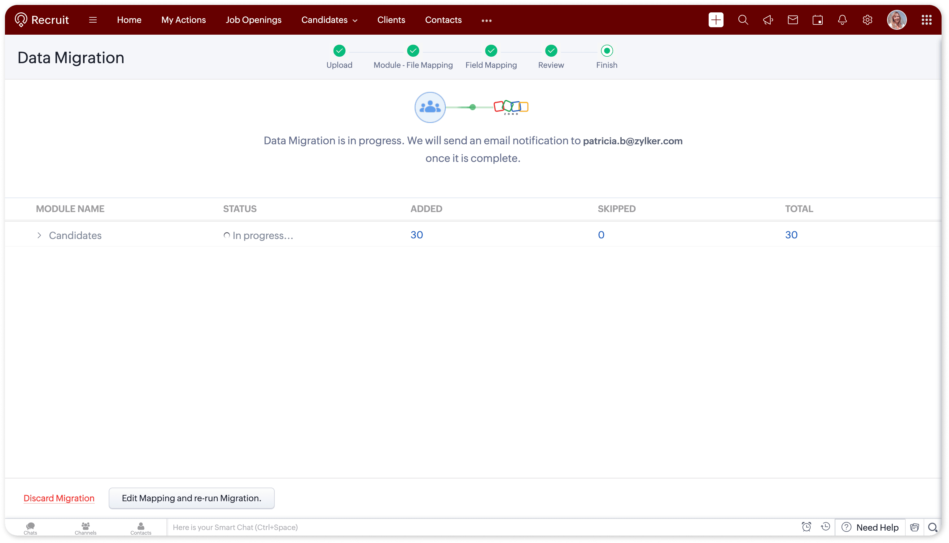 Zoho Recruit では、各インポート完了後に概要が提供されます。