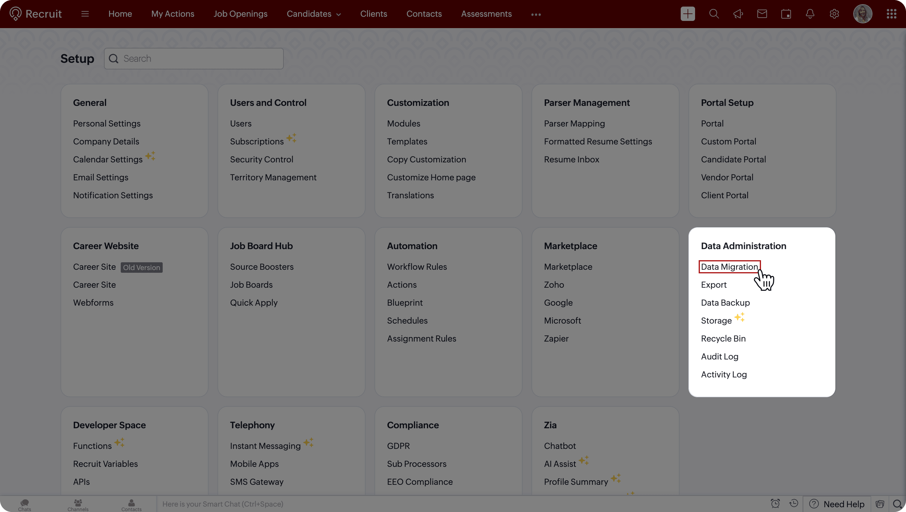 Zoho Recruit: データのインポートおよび[管理]タブにアクセスできる管理者またはスーパー管理者権限