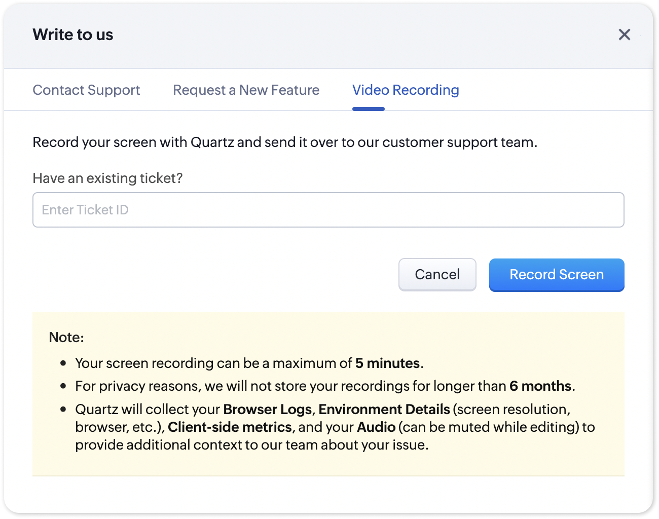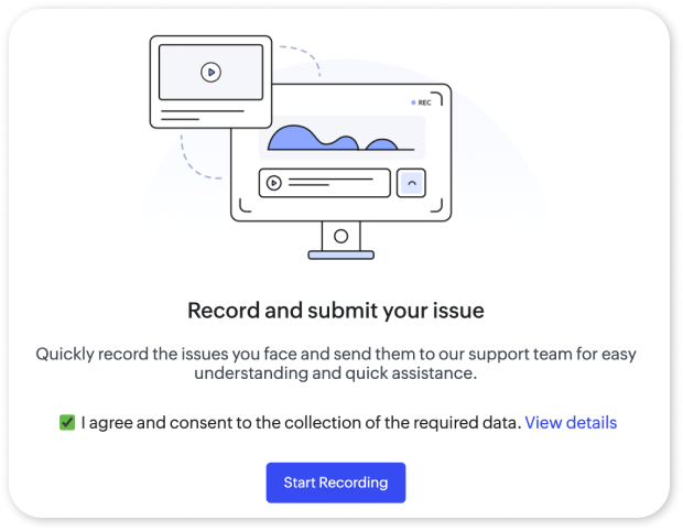 Zoho Recruitの組み込み顧客サポートシステムを利用してフィードバックを送信する際、Video Recordingオプションを使用してQuartzで画面を録画できます。これにより、発生している問題を実際に示しながら顧客サポートチームに送信できるため、サポート担当者が状況をより正確に把握し、迅速かつ効率的に解決策を提供できます。