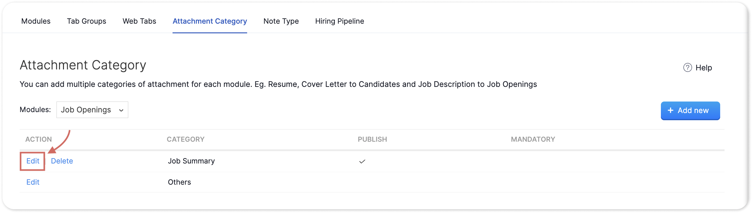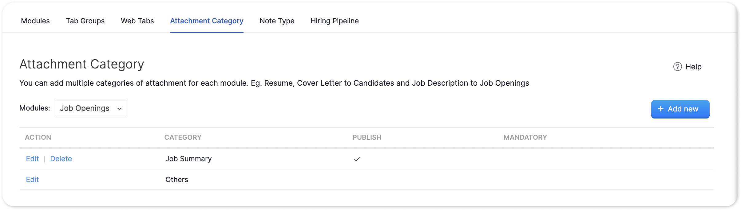 : 初期設定では、リクルーターと管理者の両方が添付ファイルカテゴリーの作成、変更、削除を行う権限を持っています。