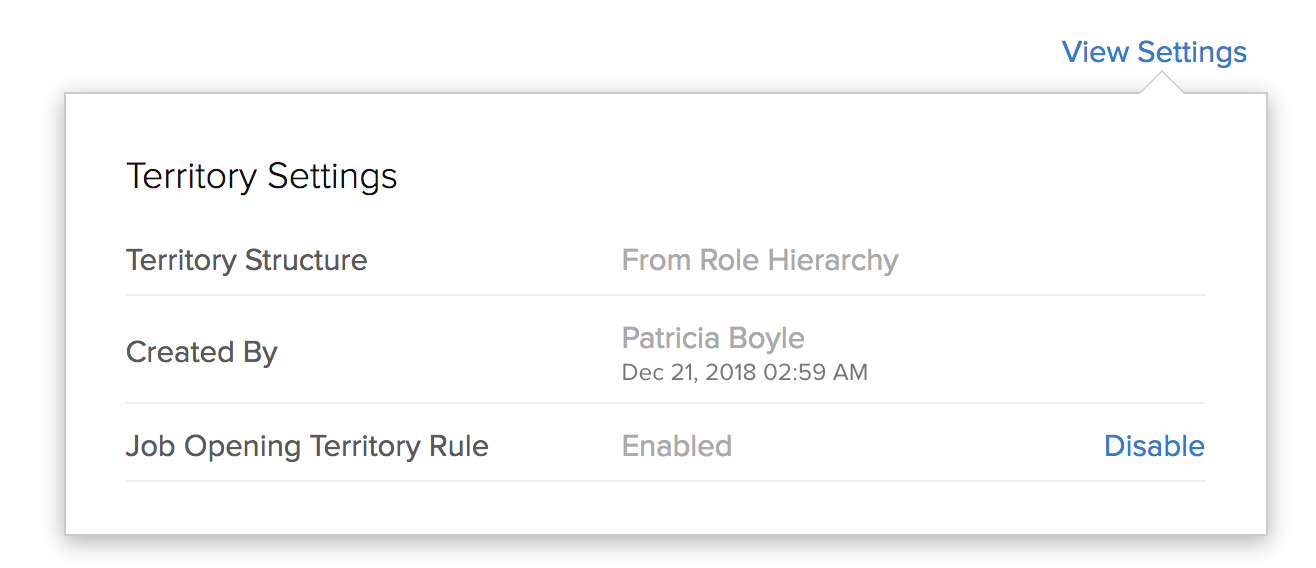 - 採用のニーズに応じてテリトリーマネジメントを無効にすることができます。機能を再度有効にした場合でも、テリトリー構成は変更されません。