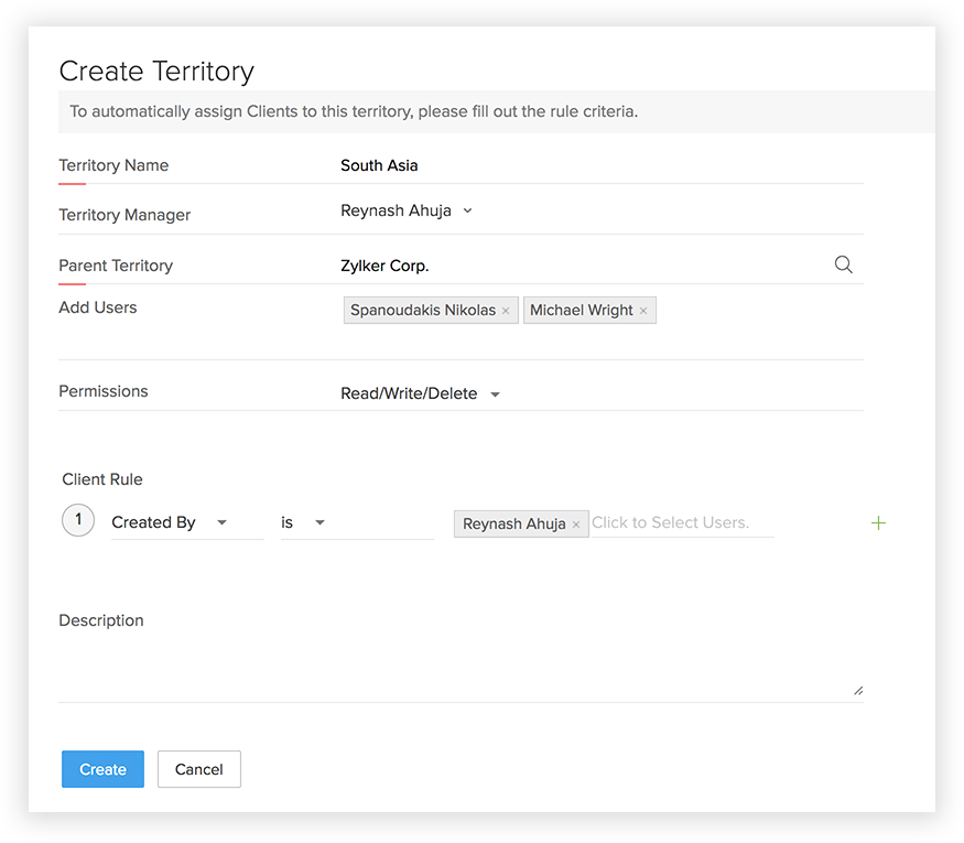 このルール条件に基づき、territories が Zoho Recruit 内のクライアントを担当します。