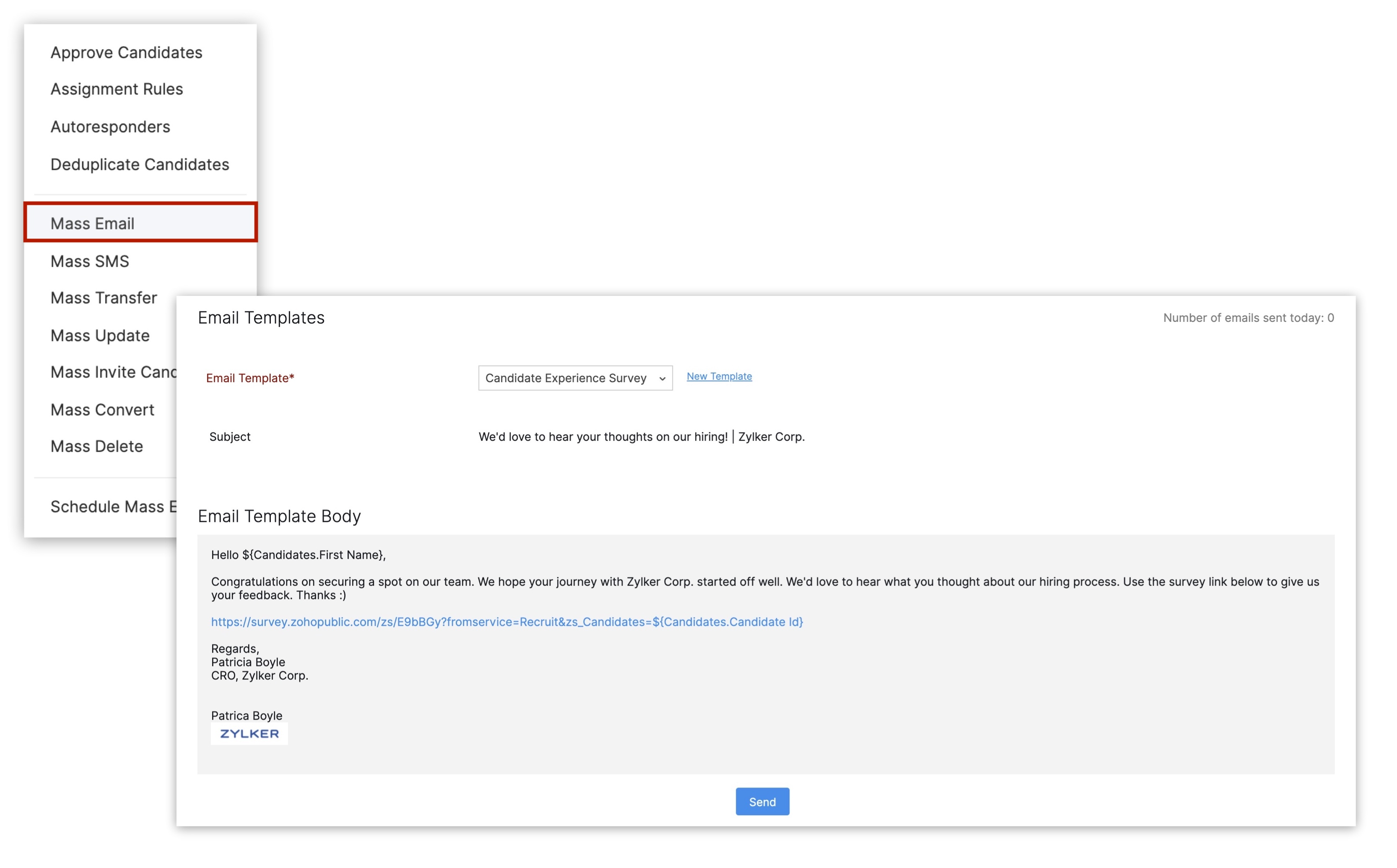 Surveyリンクを含むメールテンプレートを作成した後、連絡先に対してアンケートメールを送信できます。メールアンケートは、Zoho Recruit内で利用可能なすべてのメール送信設定から送信が可能です。主な方法は以下の通りです:
