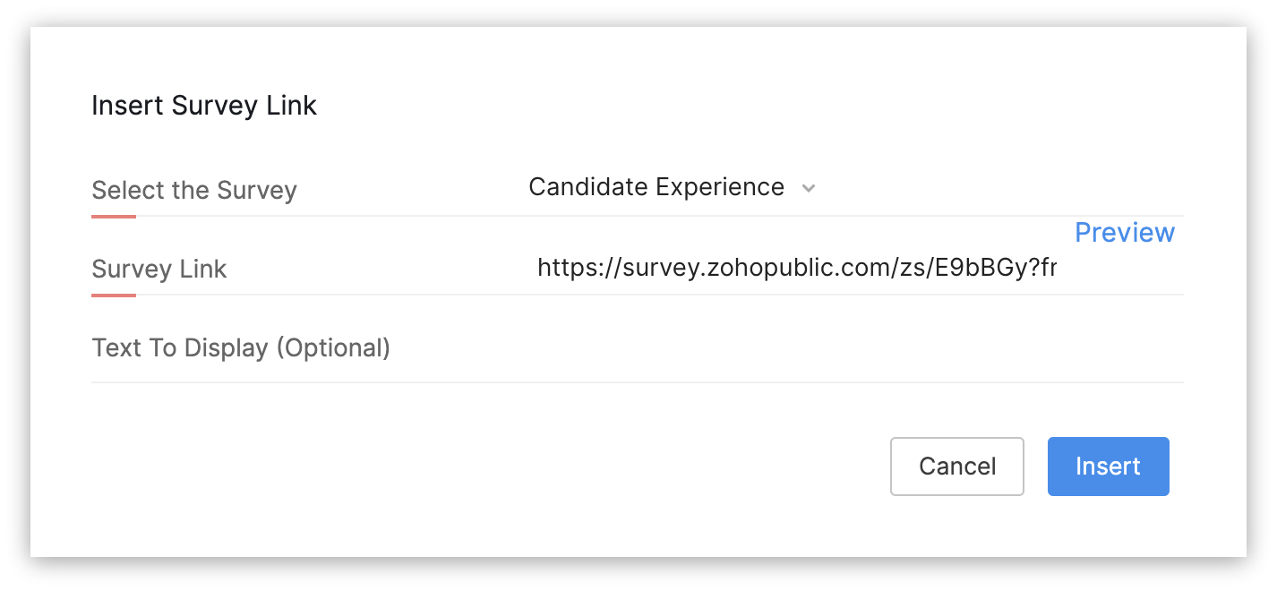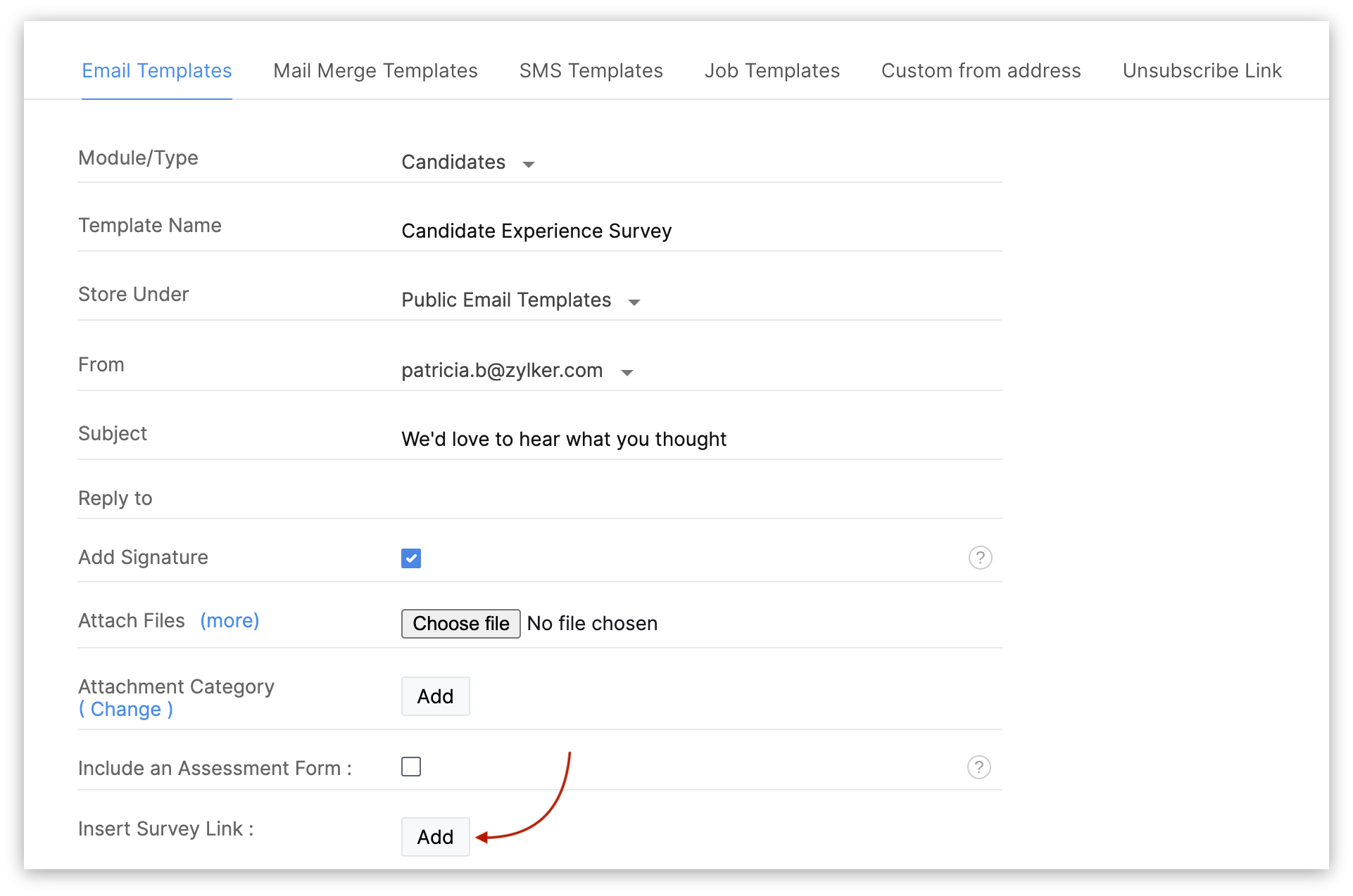 管理 メール テンプレート権限が有効になっているZoho Recruit ユーザーのみ、Survey リンクの挿入やメールテンプレートの作成が可能です。