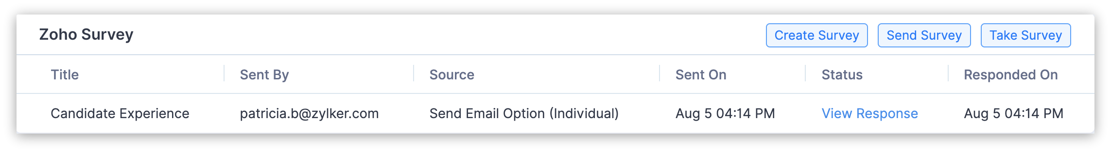 Zoho Surveyセクションの関連リストには、そのデータに送信されたメール調査の詳細が一覧表示されます。