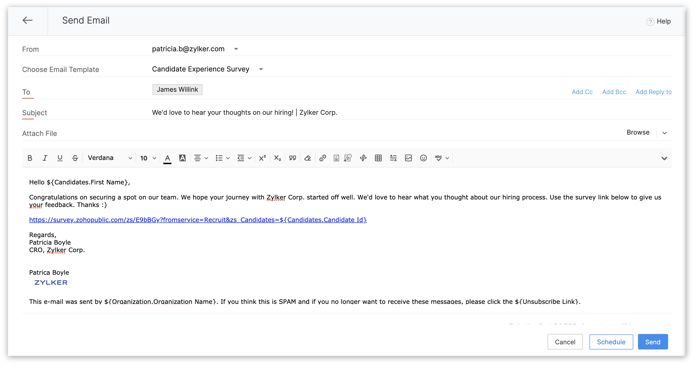 Zoho Surveyでアンケートを作成した後、Zoho Recruitからすべての連絡先にメールで送信できます。アンケートへのリンクを含むメールテンプレートを作成する必要があります。このテンプレートは、連絡先へのメールに挿入して使用できます。