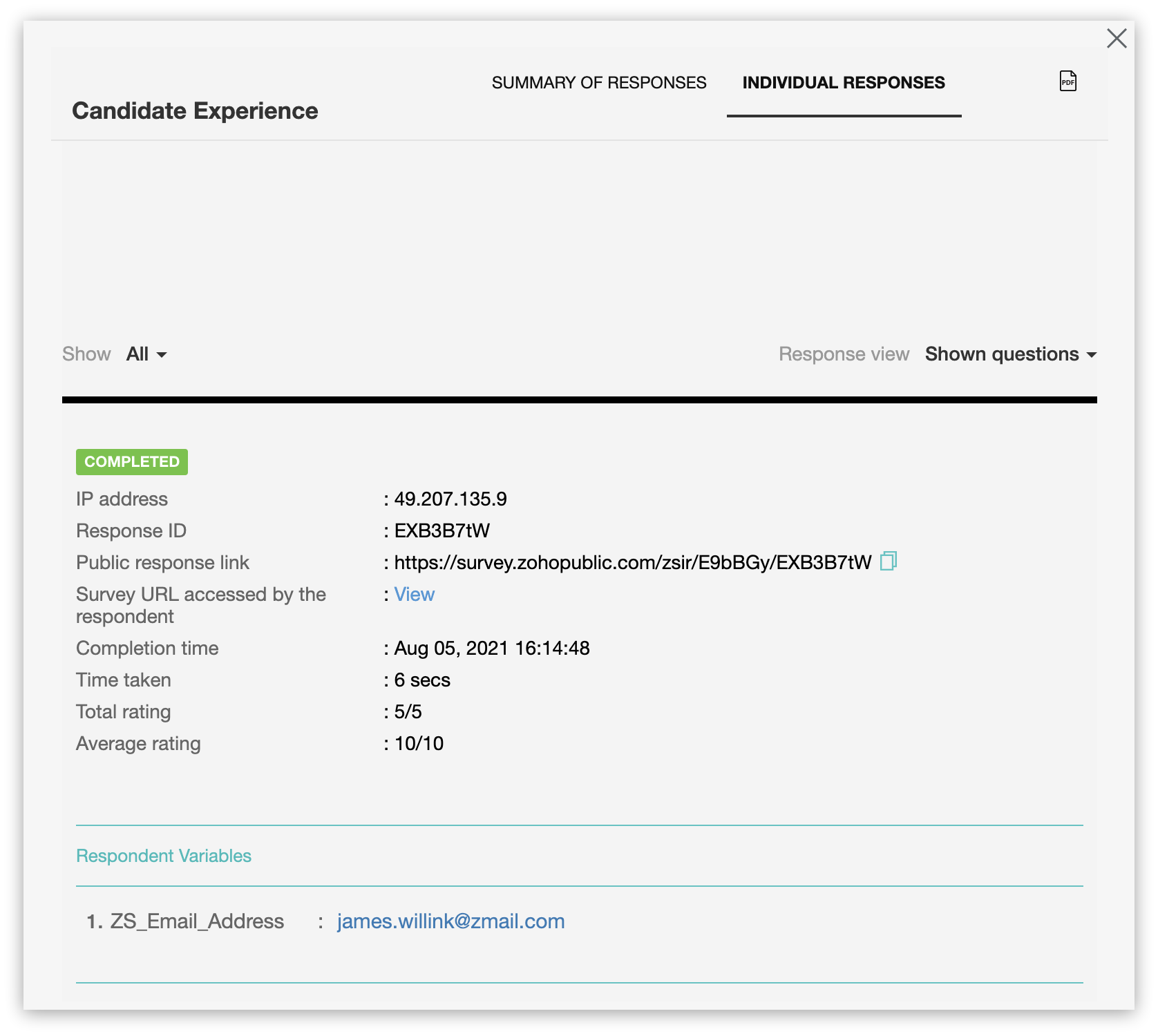 1. 個人レポート -個人Responseをクリックすると、候補者や連絡先による実際の回答内容、回答時間、IPアドレスなど詳細を確認できます。