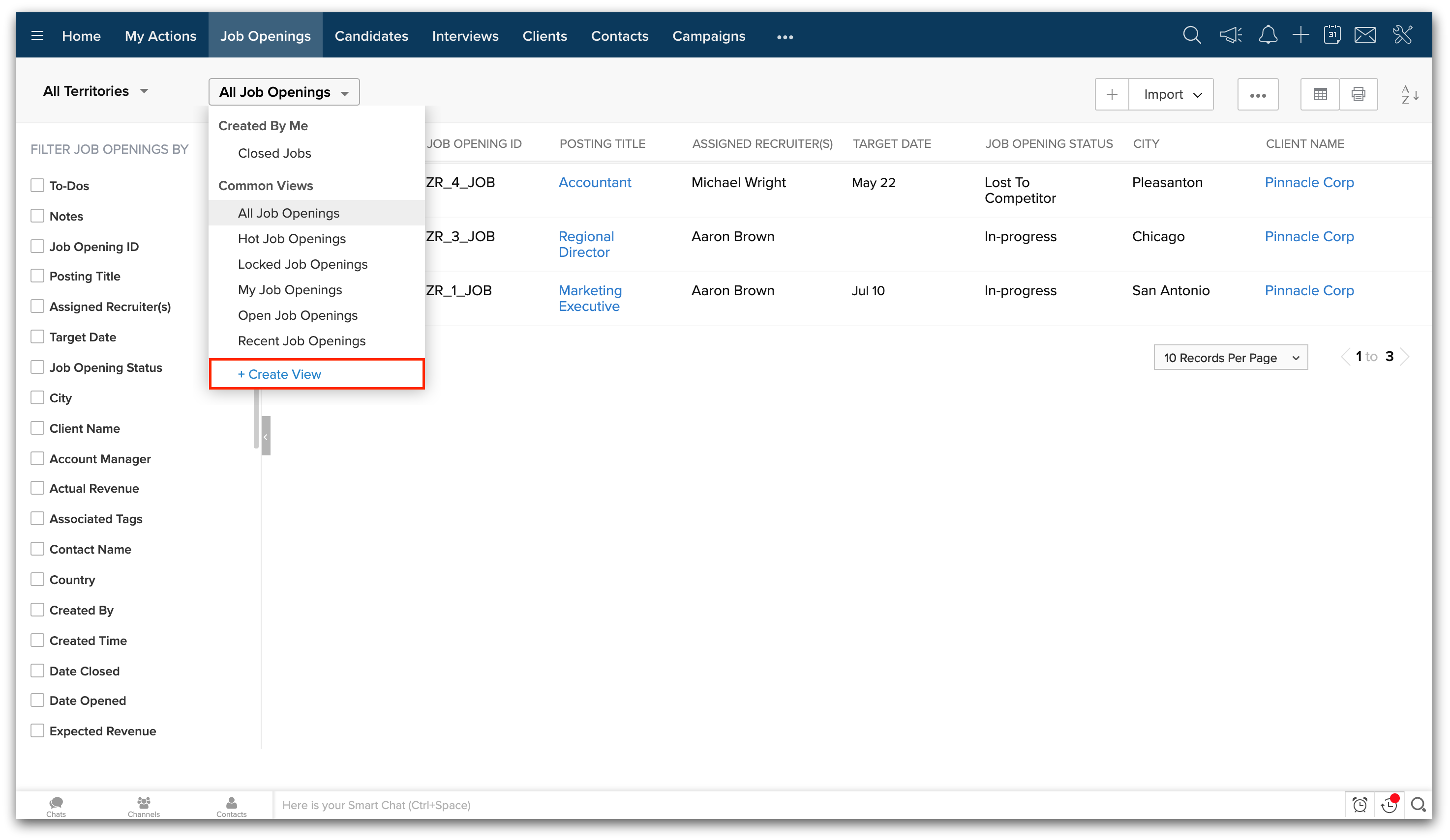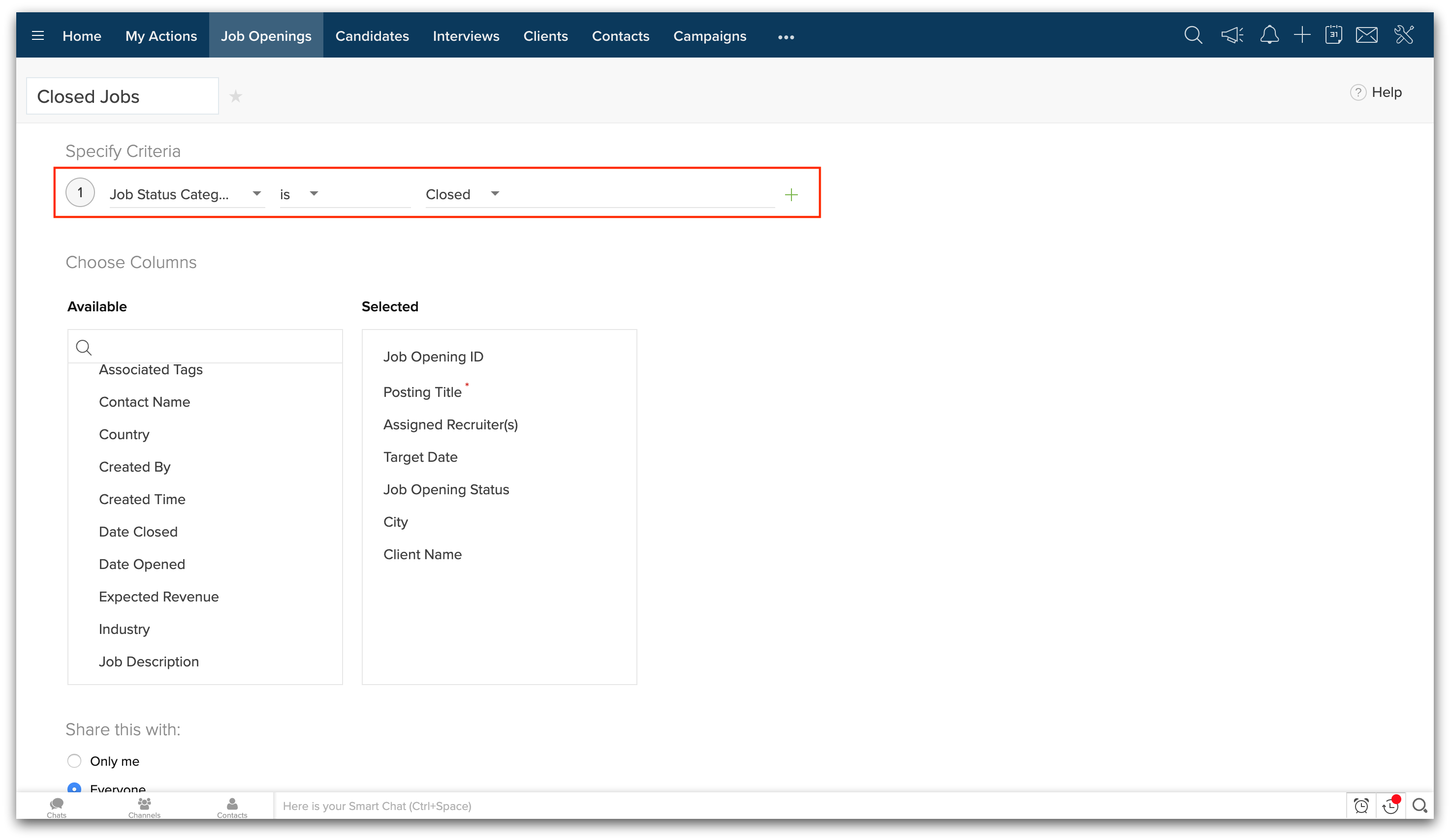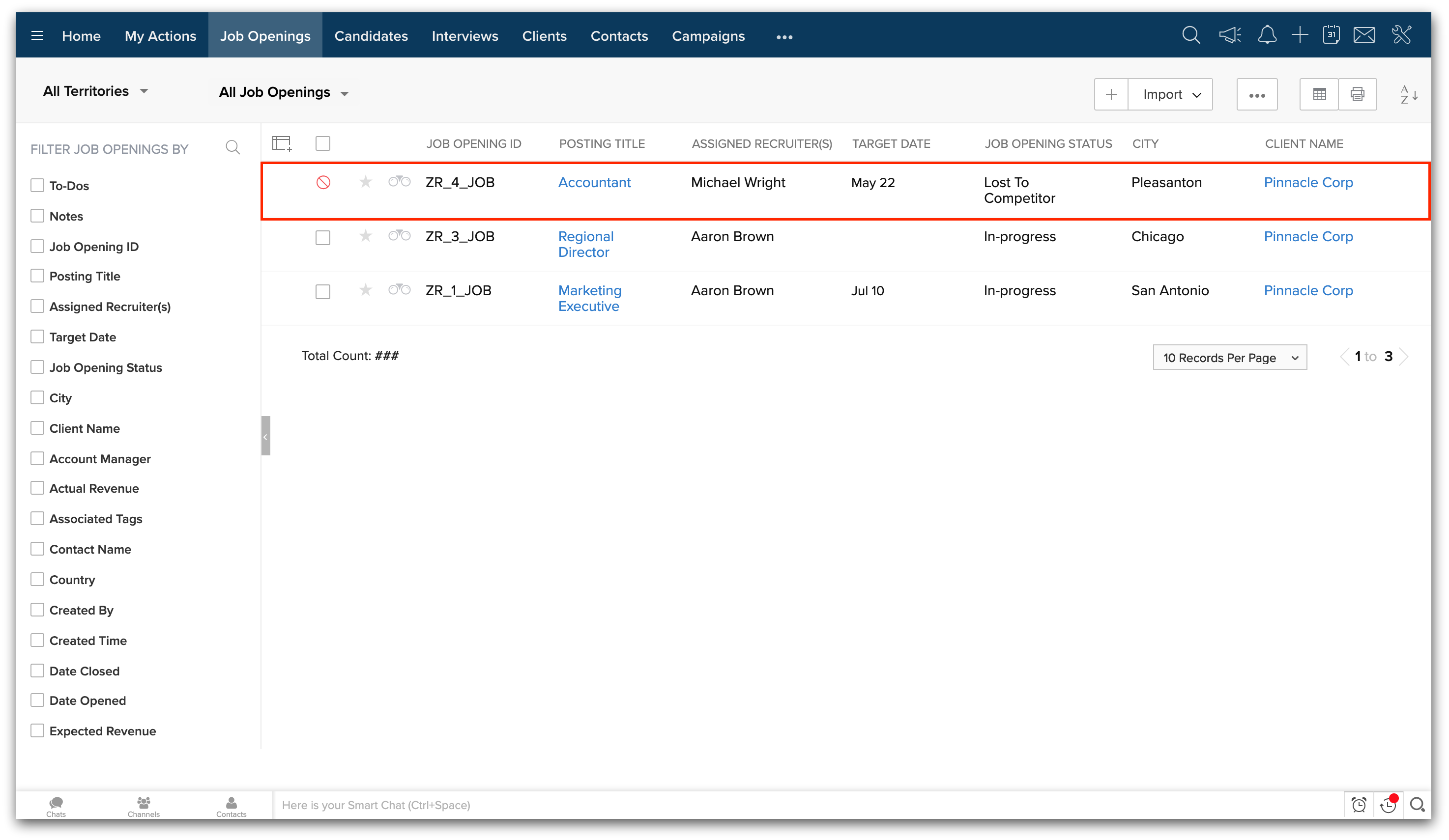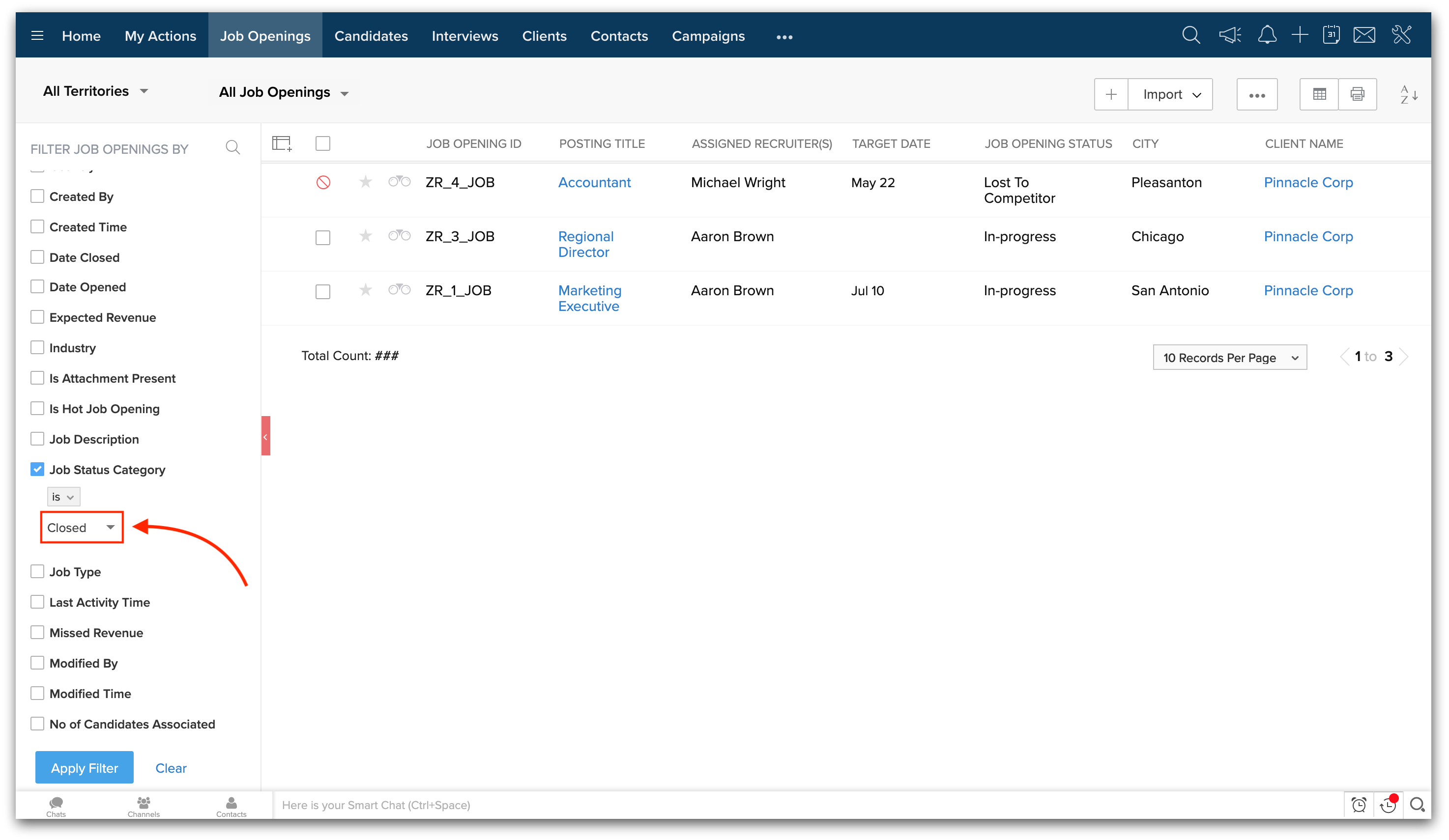 2. 左側のフィルターを使用して、既存のレコードをOpen/Closedのジョブオープニングに絞り込むことができます。