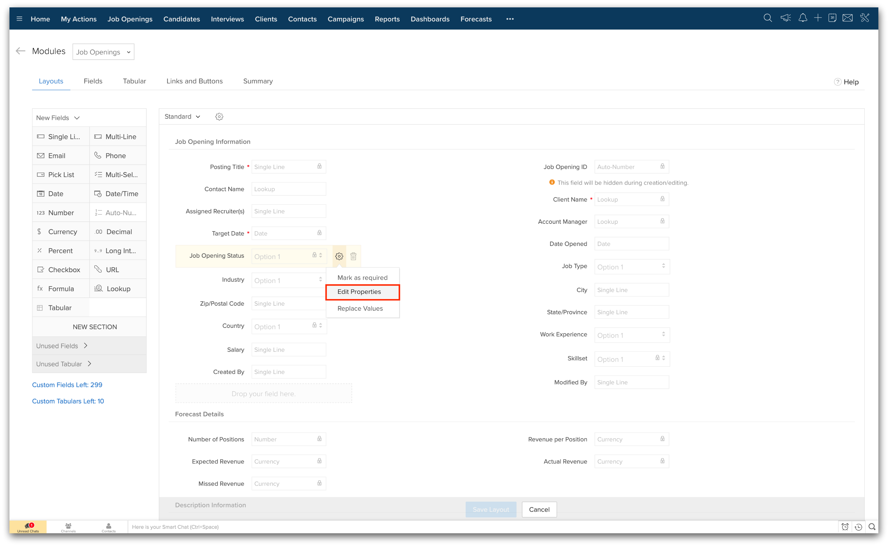 2. ジョブオープンステータスをホバーし、設定>プロパティを編集をクリックしてください。