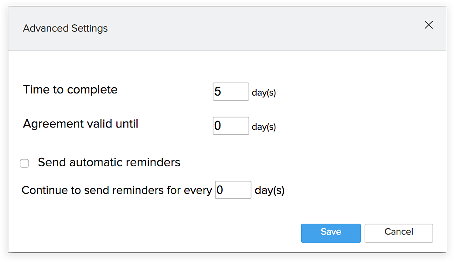 - その他 設定をクリックし、完了までの時間、期限日、リマインダー自動送信を設定します。保存をクリックします。
