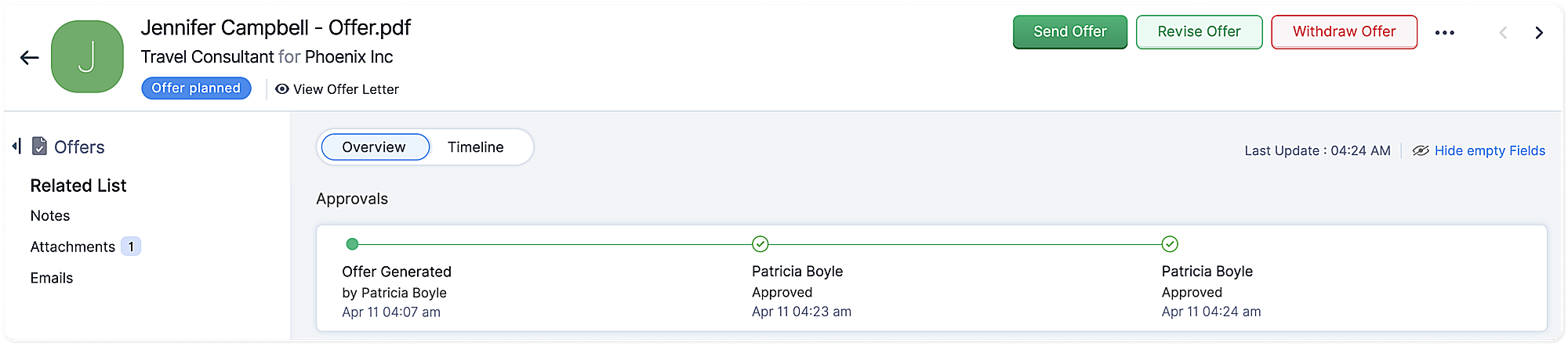 - 候補者に対して作成済みのすべてのオファーは、このセクションに一覧表示されます。